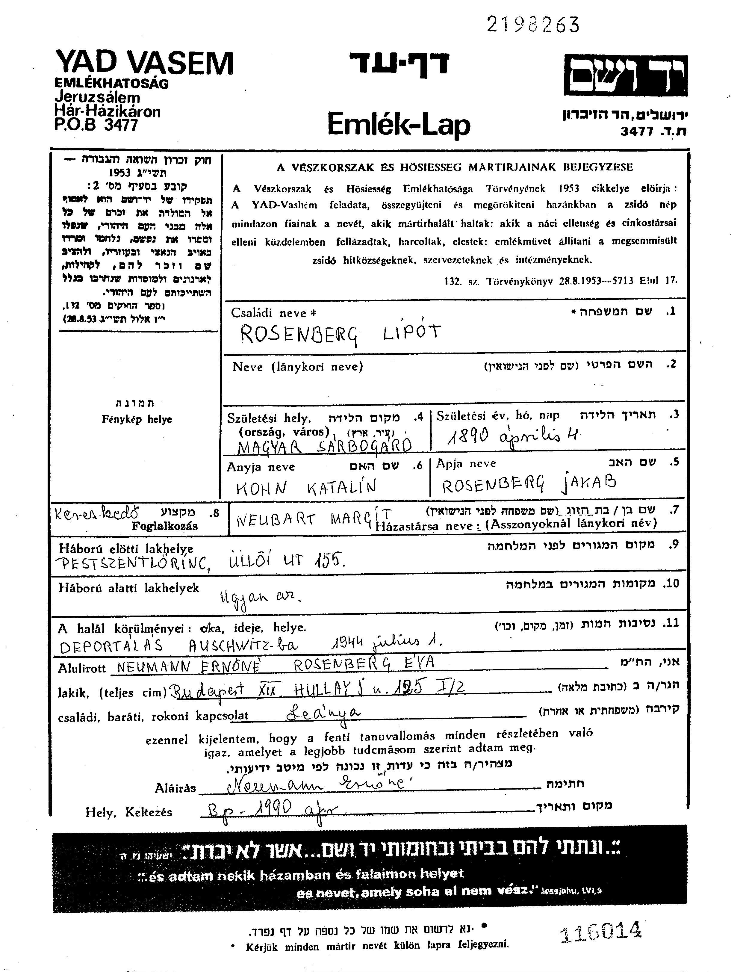 Rosenberg | Lipot | 1890 | Pestszentlorinc, Ungarn | Liste von ermordeten Juden aus Ungarn |