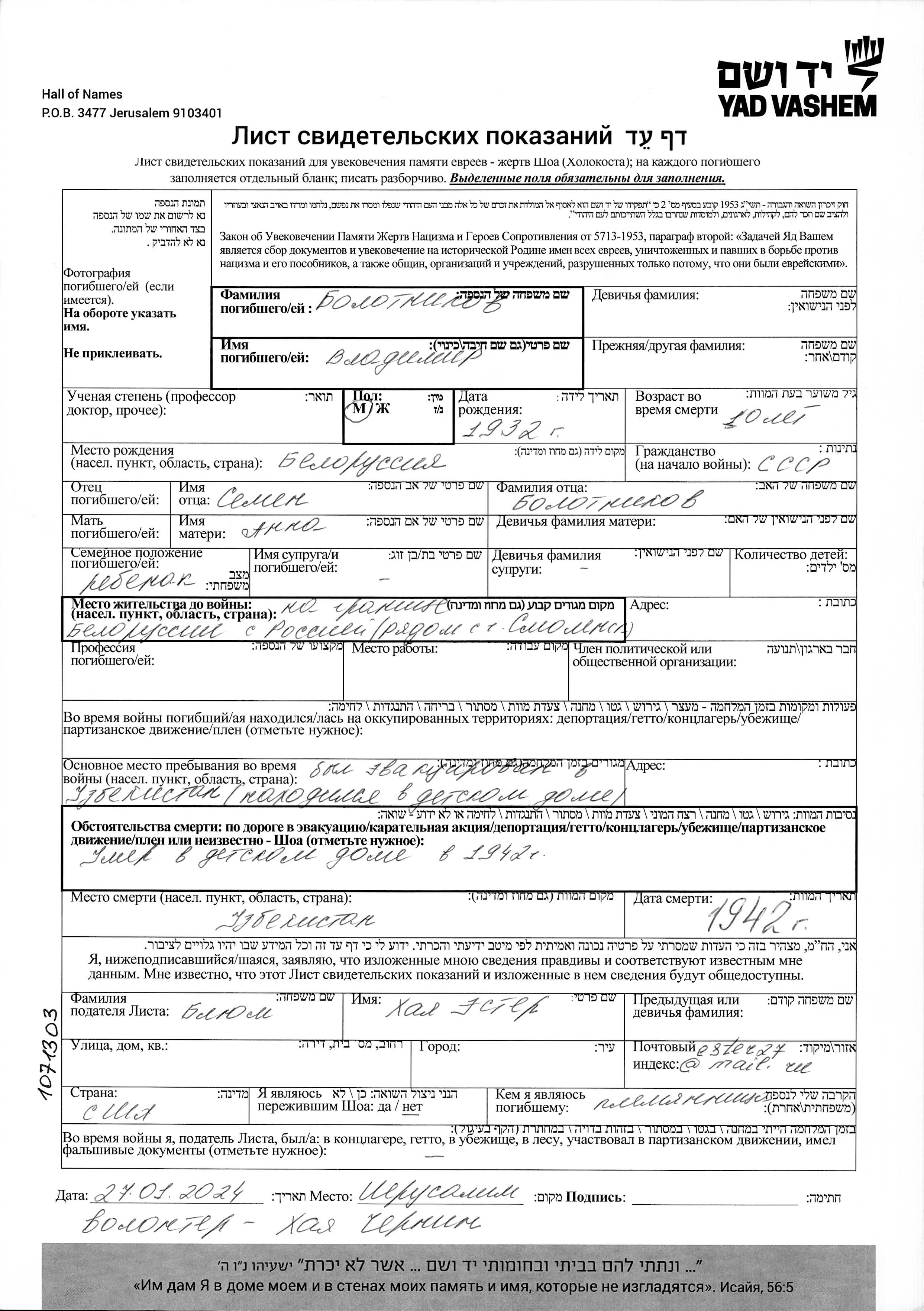 Vladimir Bolotnikov wurde im Jahr 1932 in Weißrussland (UdSSR) geboren. Er war der Sohn von Semyon und Anna. Er war Kind. Vor dem Zweiten Weltkrieg lebte er in Smolensk, Russland (UdSSR). Während des Krieges war er in Uzbekistan (UdSSR).