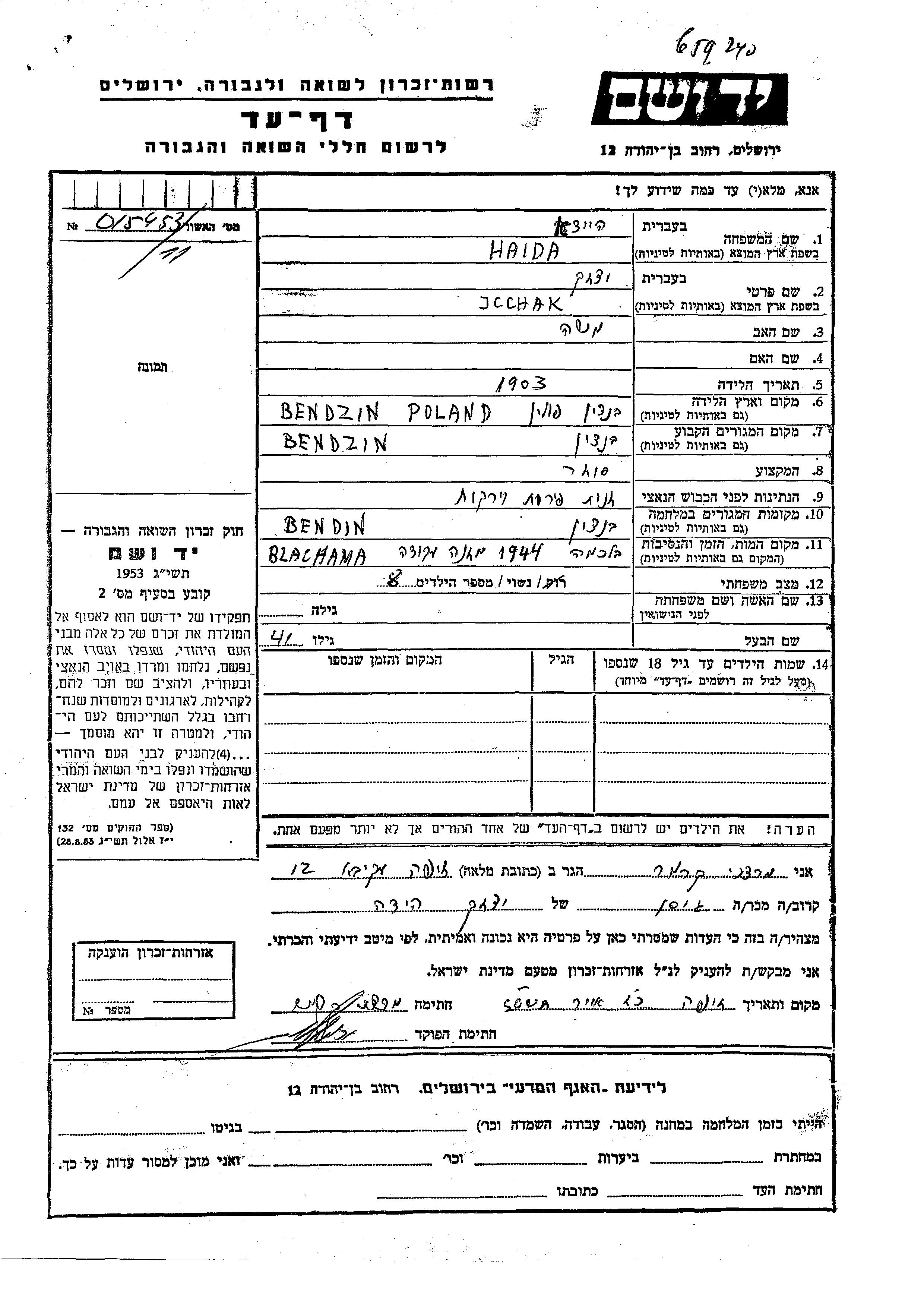 Jcchak Haida wurde im Jahr 1903 in Bendzin, Polen geboren. Er war der Sohn von Moshe. Er war Obsthändler/-in und Verheiratet. Vor dem Zweiten Weltkrieg lebte er in Bendzin, Polen. Während des Krieges war er in Bendin, Polen.