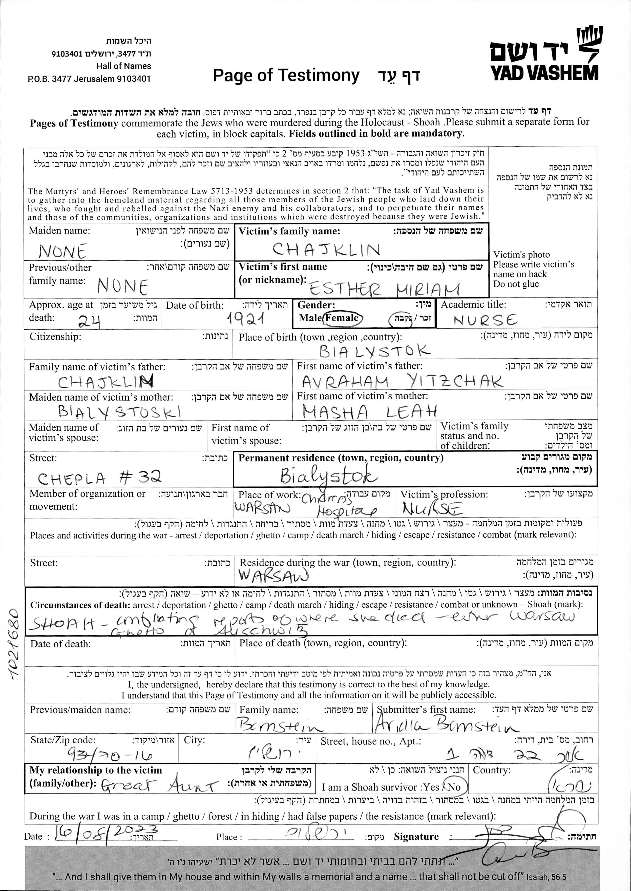 Chajklin Esther Miriam 1921 Bialystok, Polen Gedenkblatt