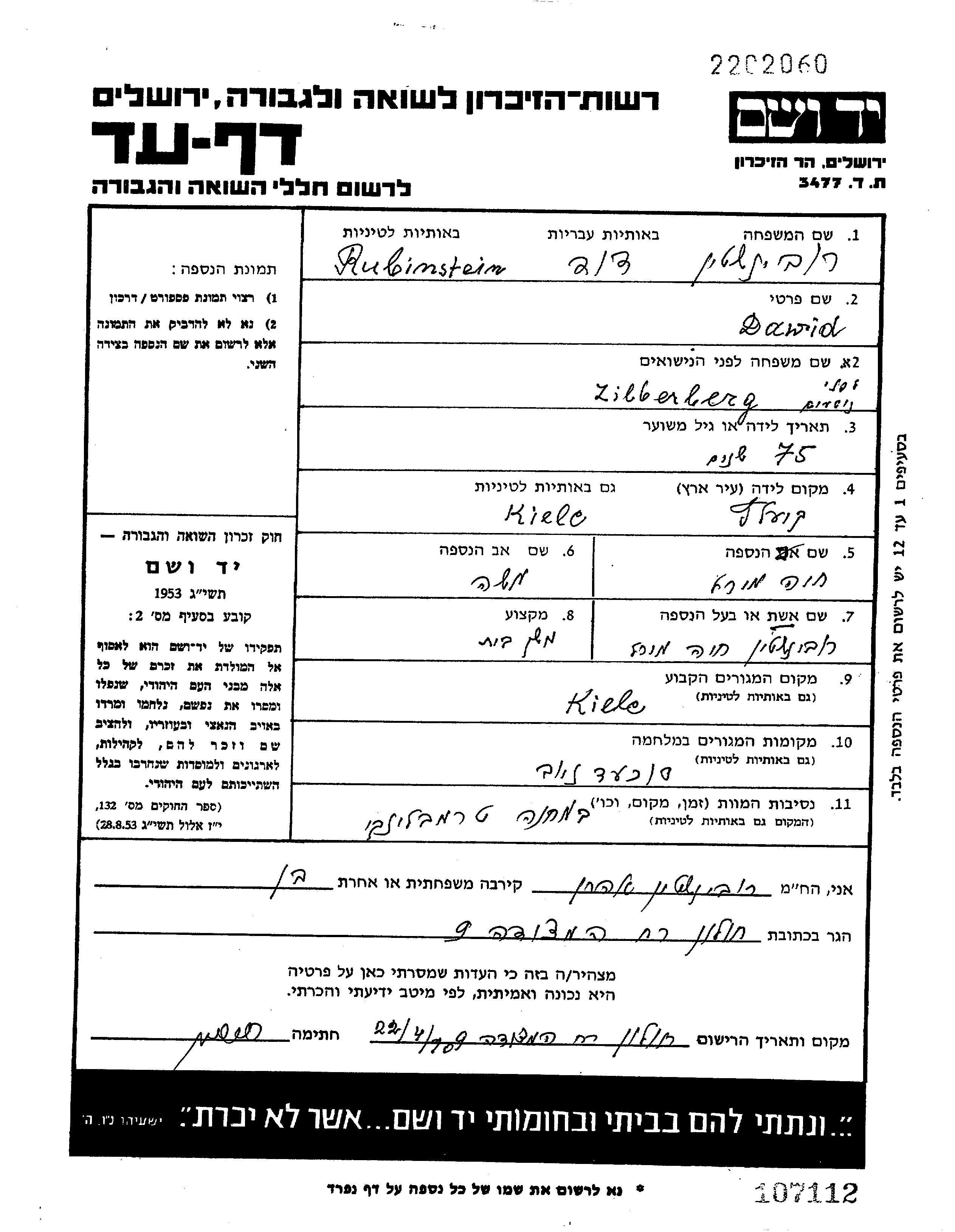 Rubinshtein David Kielce, Polen Liste ermordeter Juden aus Gedenkbuechern (Yizkor Books)