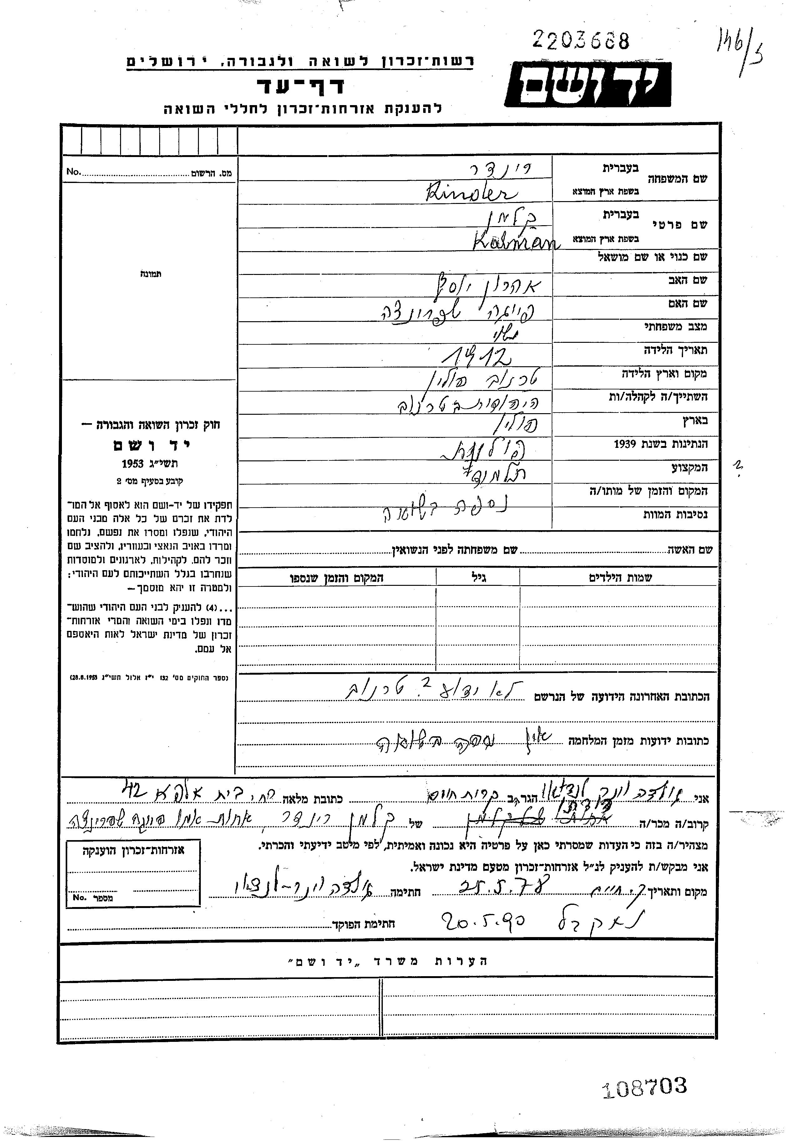 Kalman Rinder wurde im Jahr 1912 in Tarnow, Polen geboren. Vor dem Zweiten Weltkrieg lebte er in Tarnow, Polen.