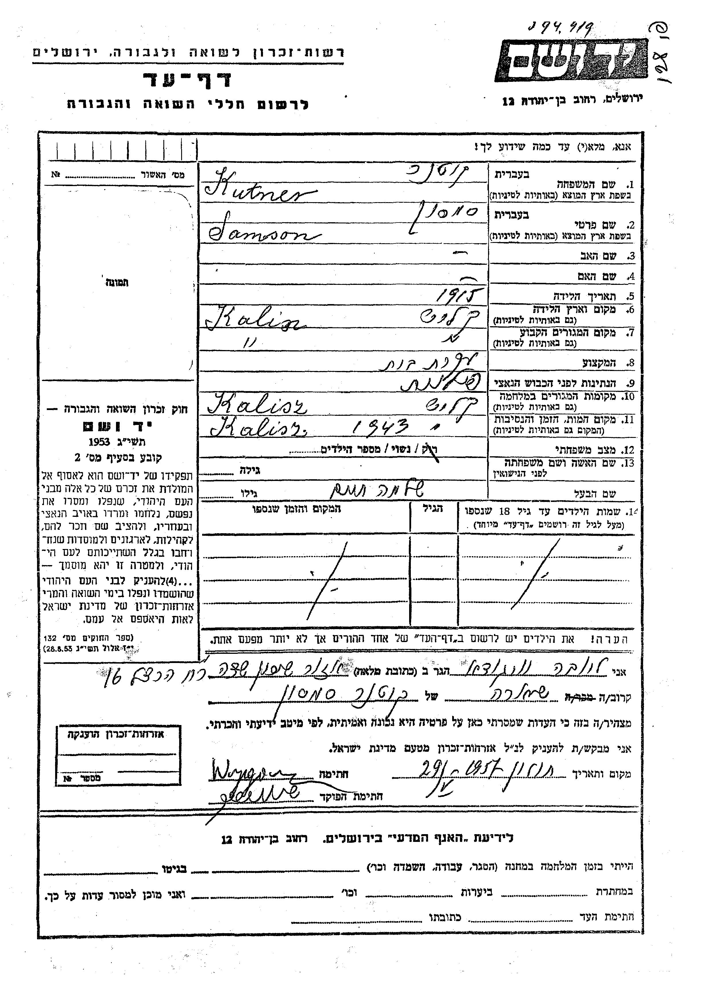 Gita Lea Kutner, geb. Samson wurde im Jahr 1915 in Kalisz, Polen geboren. Sie war Hausfrau und mit Shlomo Khaim Verheiratet. Vor dem Zweiten Weltkrieg lebte sie in Kalisz, Polen. Während des Krieges war sie in Kalisz, Polen.