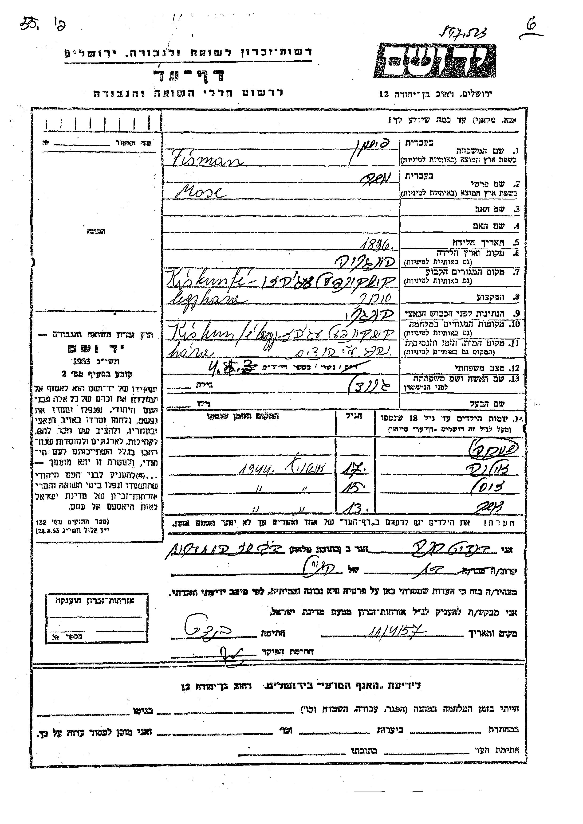 Fisman Moshe 1896 Kiskunfelegyhaza, Ungarn Gedenkblatt