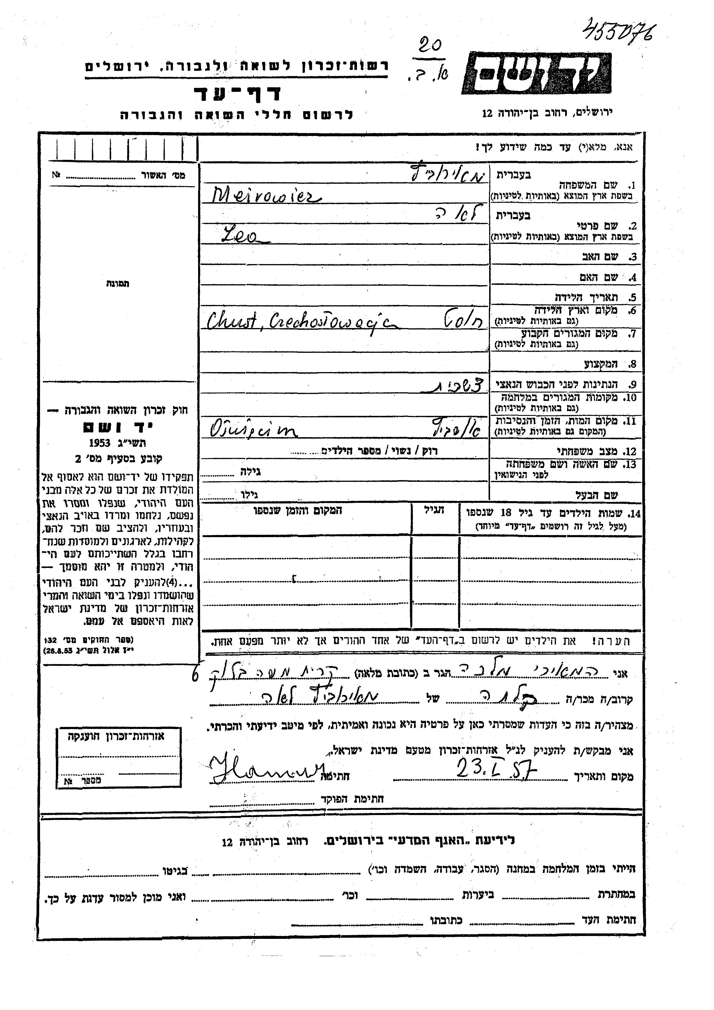Meirowicz Lea unbekannter Ort, Gedenkblatt
