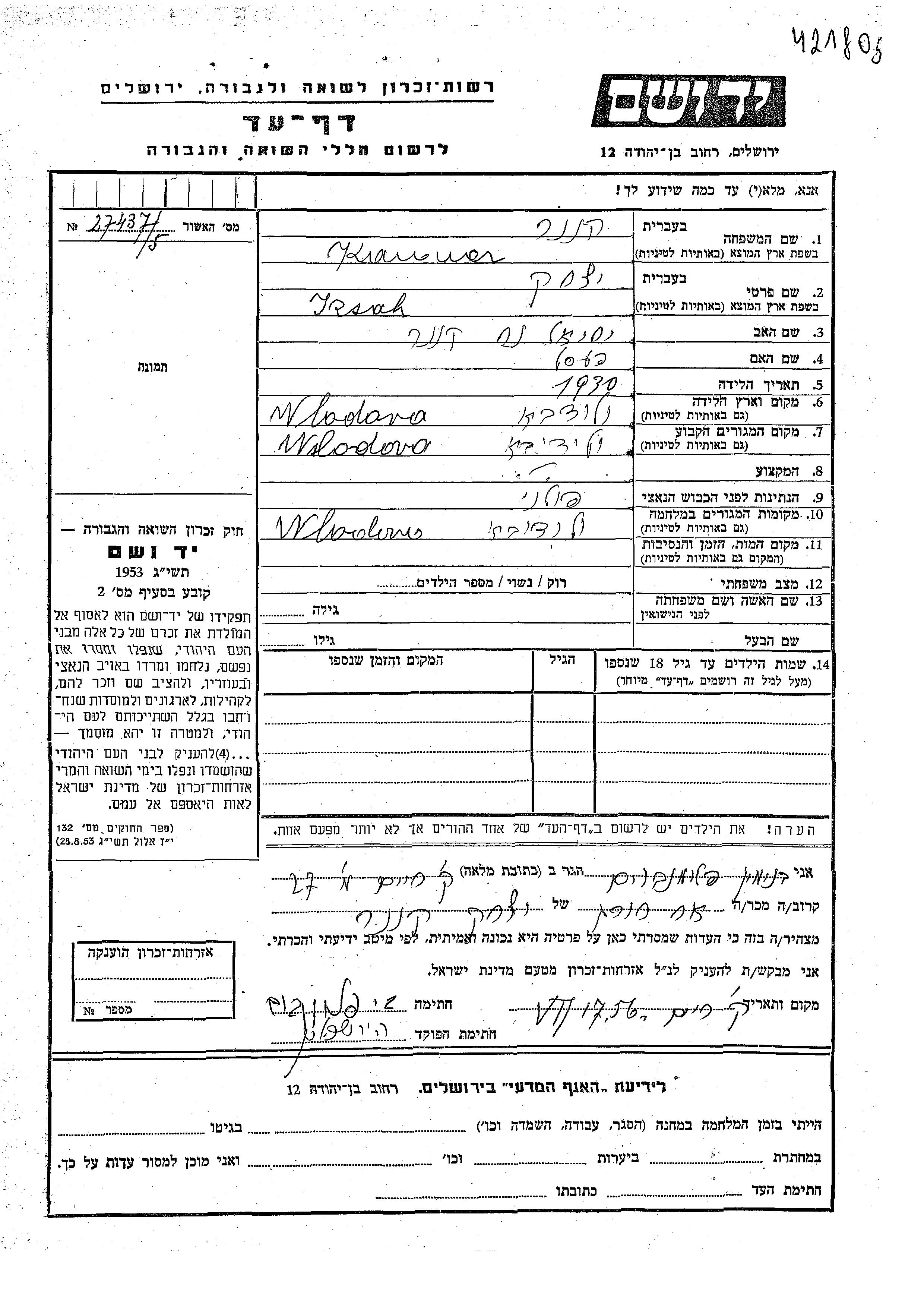 Izsak Kanner wurde im Jahr 1930 in Wlodawa, Polen geboren. Er war der Sohn von Yisrael Noakh und Pesl. Er war Kind. Vor dem Zweiten Weltkrieg lebte er in Wlodawa, Polen. Während des Krieges war er in Wlodawa, Polen.