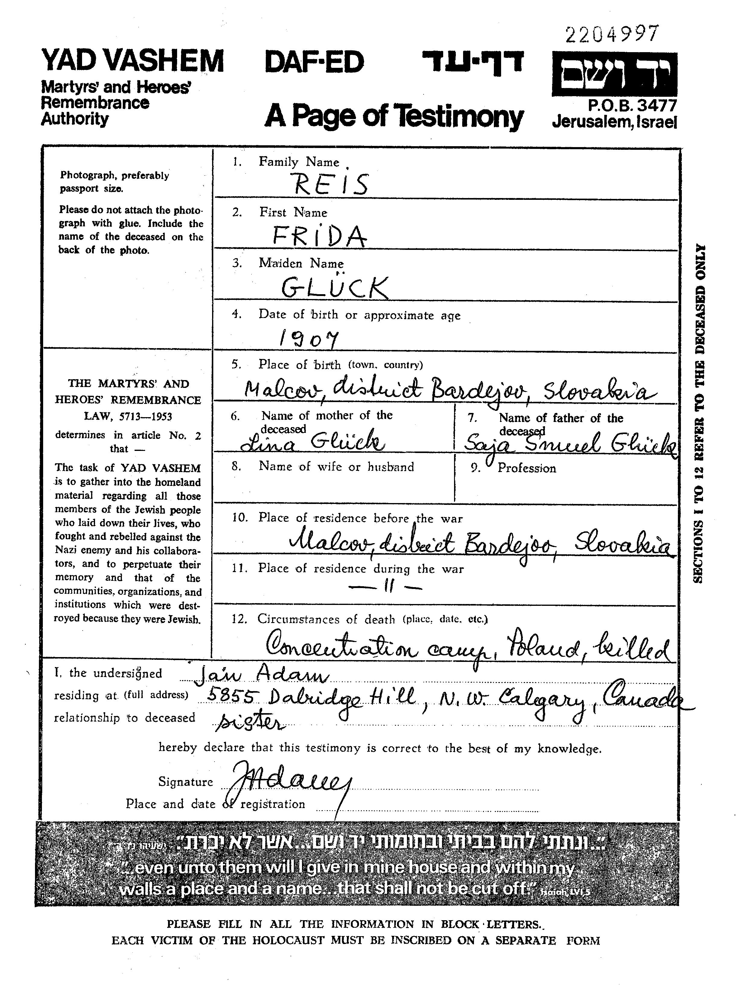 Frida Reis, geb. Gluk wurde im Jahr 1907 in Malcov, Tschechoslowakei geboren. Vor dem Zweiten Weltkrieg lebte sie in Malcov, Tschechoslowakei.