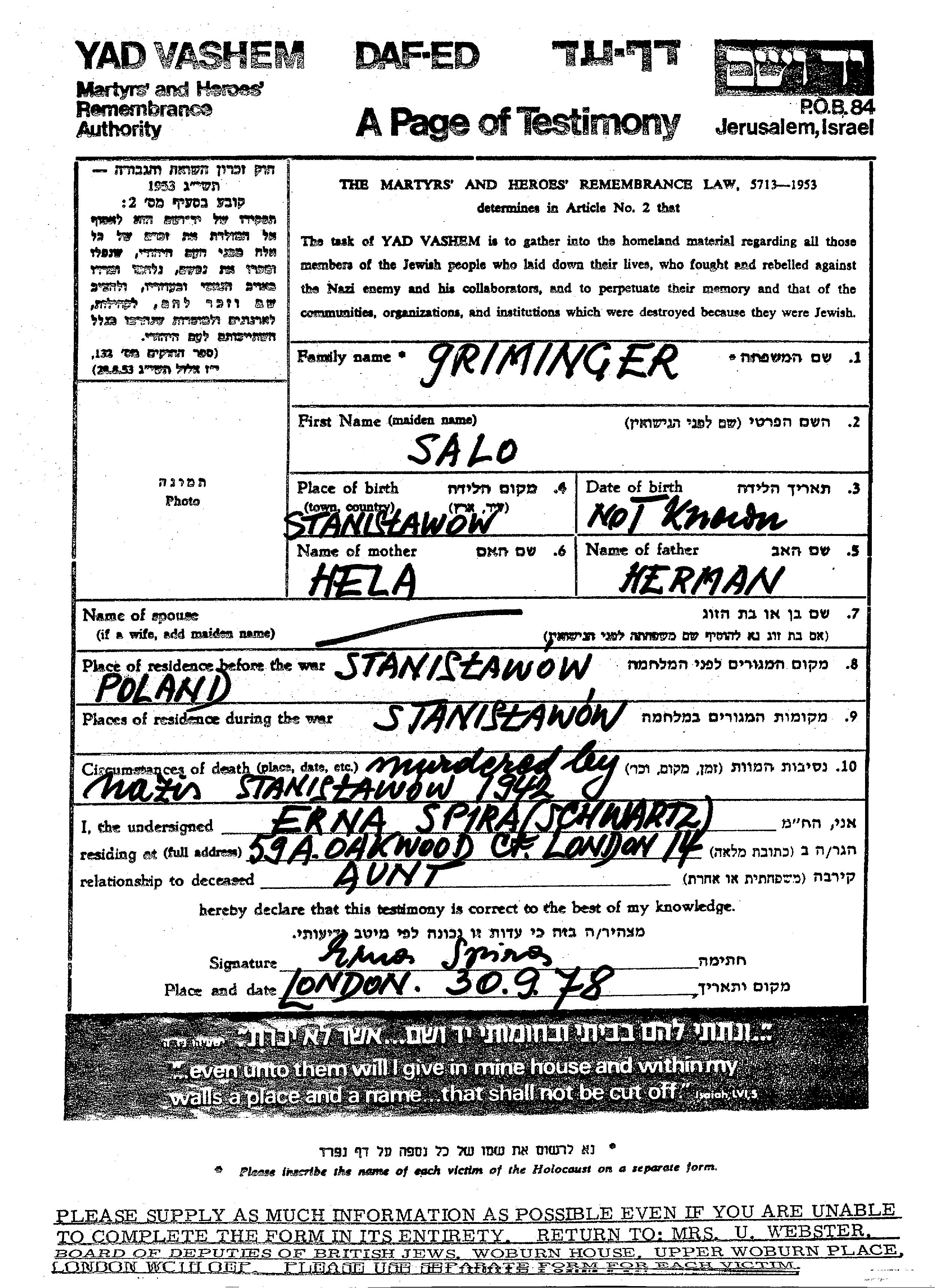 Salo wurde in der Schoah ermordet. Todesort: Stanislawow, Polen im Jahr 1942.