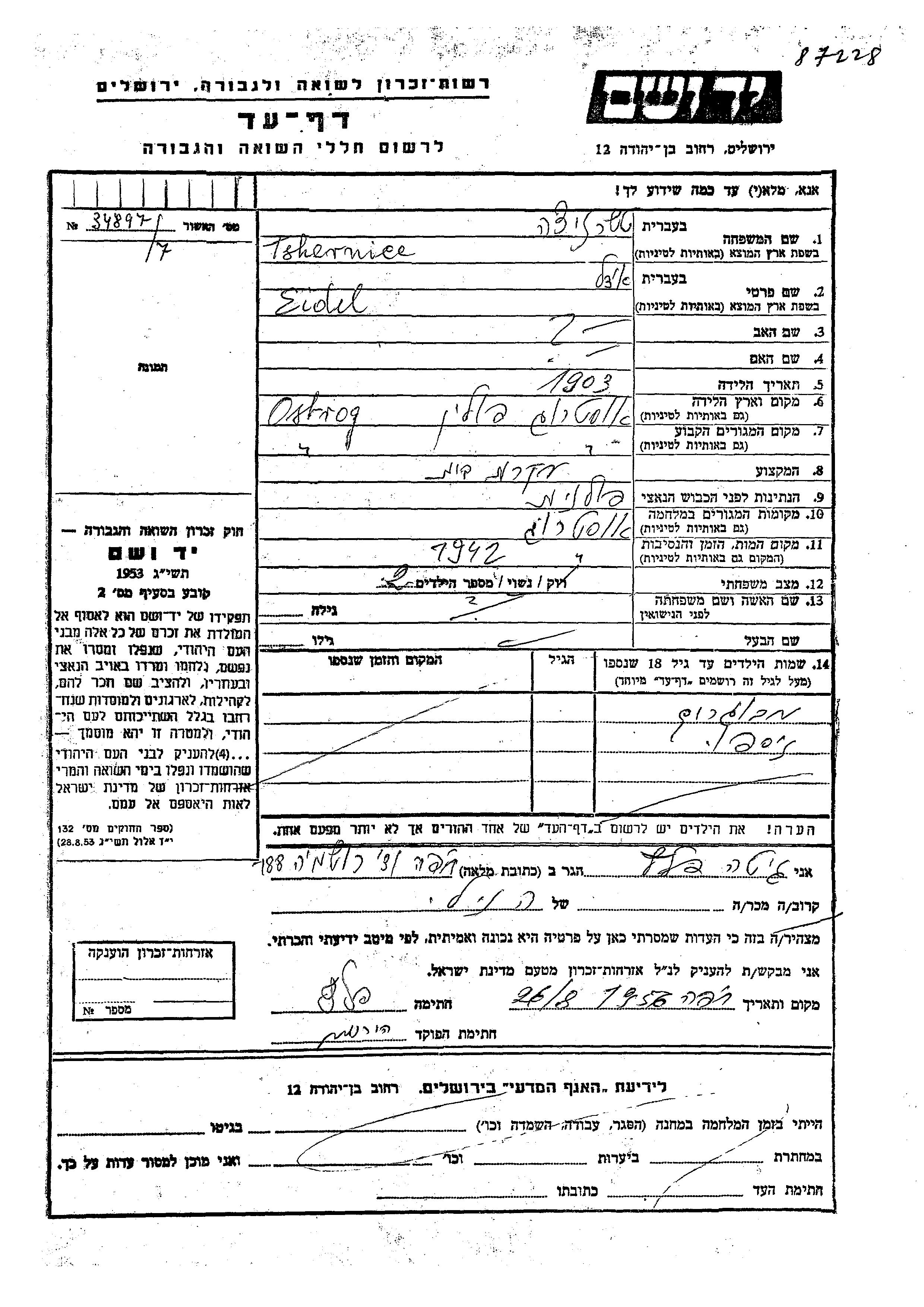 Eidel Idl Tshernice wurde im Jahr 1903 in Ostrog, Polen geboren. Sie war Hausfrau und Verheiratet. Vor dem Zweiten Weltkrieg lebte sie in Ostrog, Polen. Während des Krieges war sie in Ostrog, Polen.