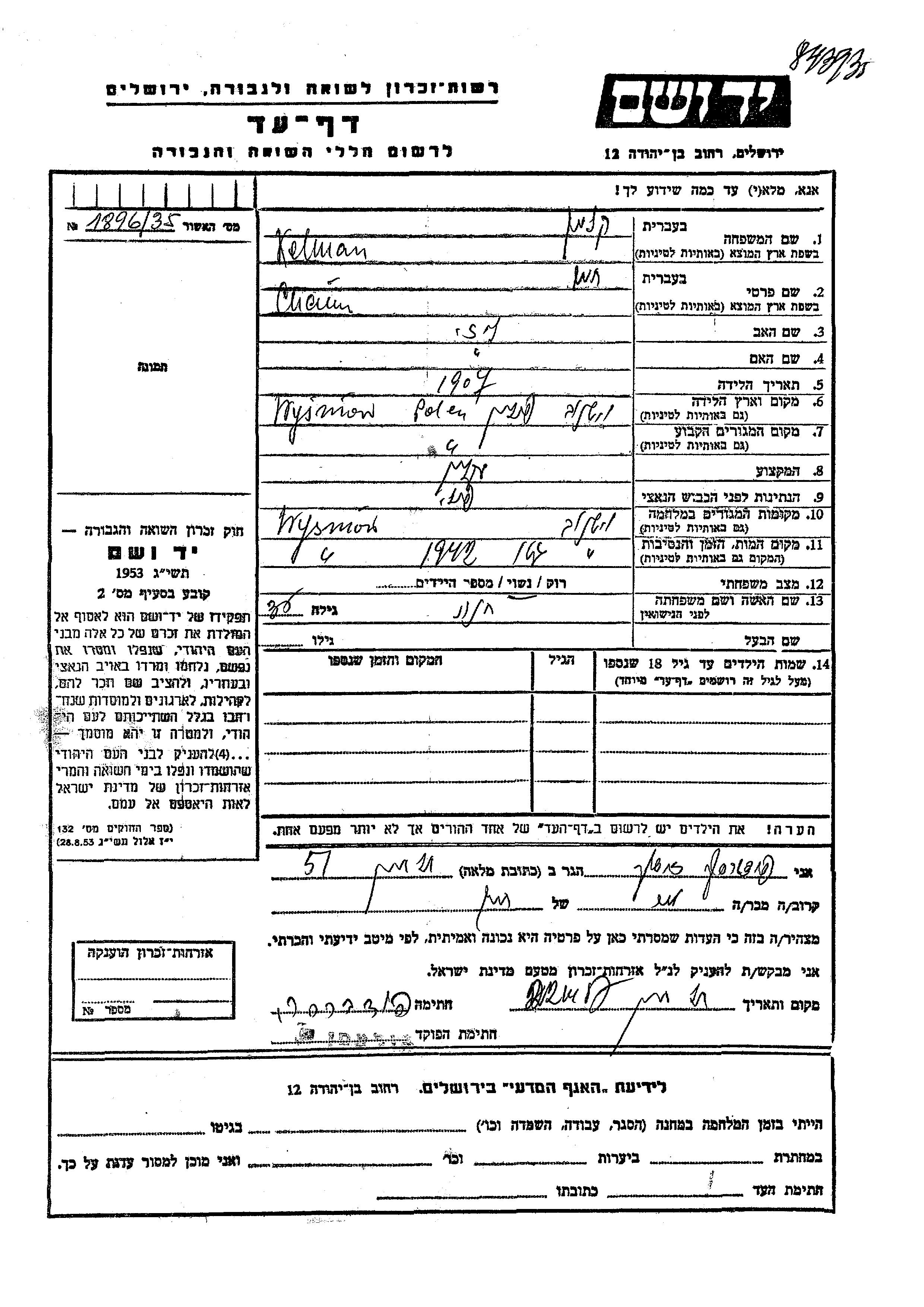 Chaim Kelman Kalman wurde im Jahr 1907 in Wiszniew, Polen geboren. Er war Fuhrmann und mit Khana Verheiratet. Vor dem Zweiten Weltkrieg lebte er in Wiszniew, Polen. Während des Krieges war er in Wiszniew, Polen.
