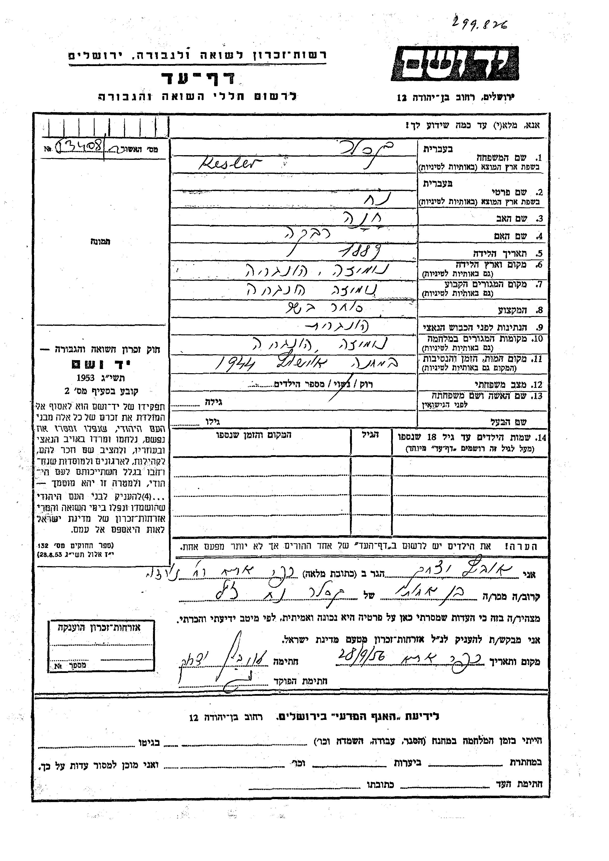 Noakh Kesler wurde im Jahr 1889 in Nimizhe, Rumänien geboren. Er war der Sohn von Khana und Rivka. Er war Meat dealer und Ledig. Vor dem Zweiten Weltkrieg lebte er in Nimizhe, Rumänien. Während des Krieges war er in Nimizhe, Rumänien.