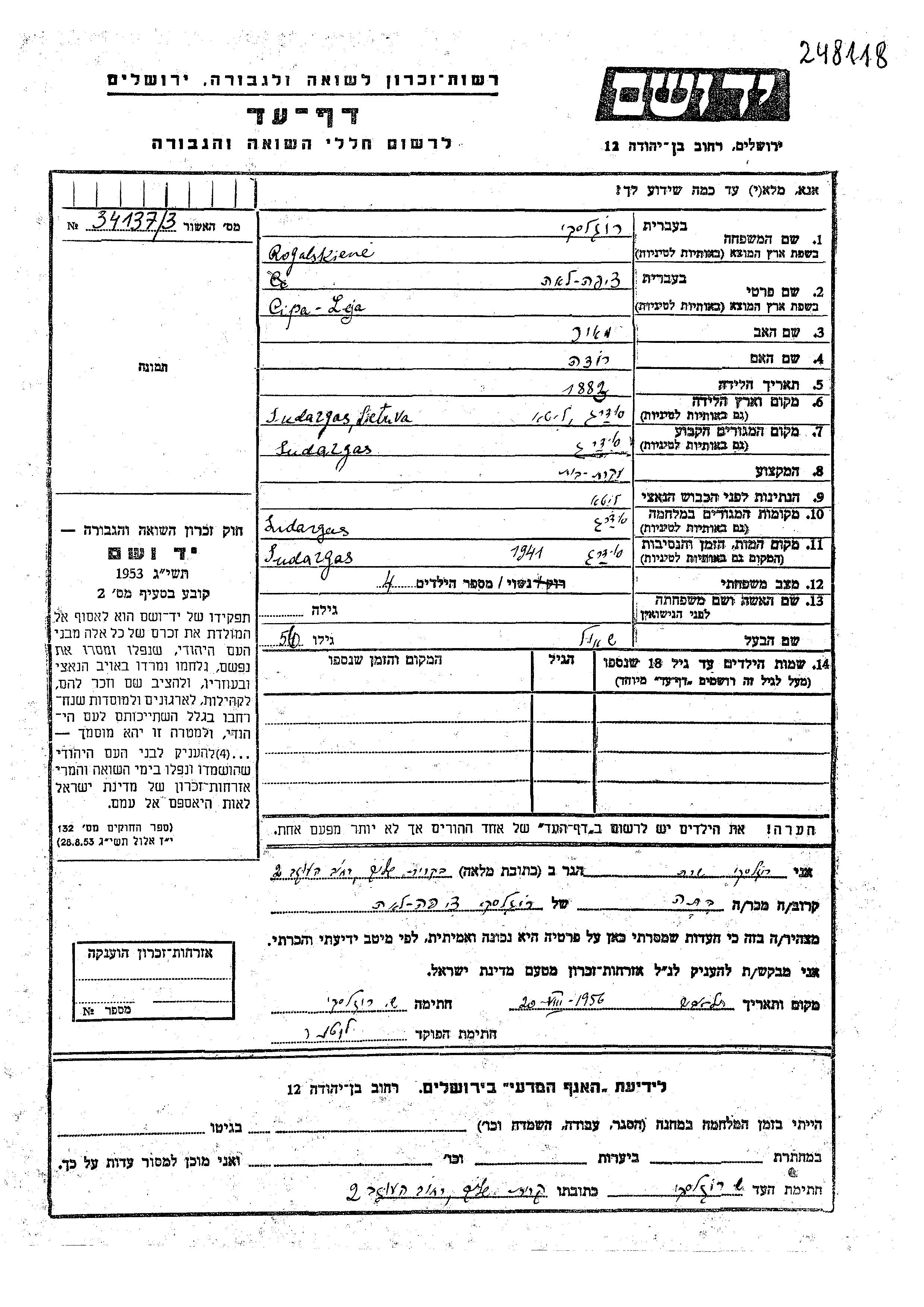 Cipa Leja Rogalskiene wurde im Jahr 1883 in Sudargas, Litauen geboren. Sie war die Tochter von Meir und Roza. Sie war Hausfrau und mit Shmul Verheiratet. Vor dem Zweiten Weltkrieg lebte sie in Sudargas, Litauen. Während des Krieges war sie in Sudargas, Litauen.