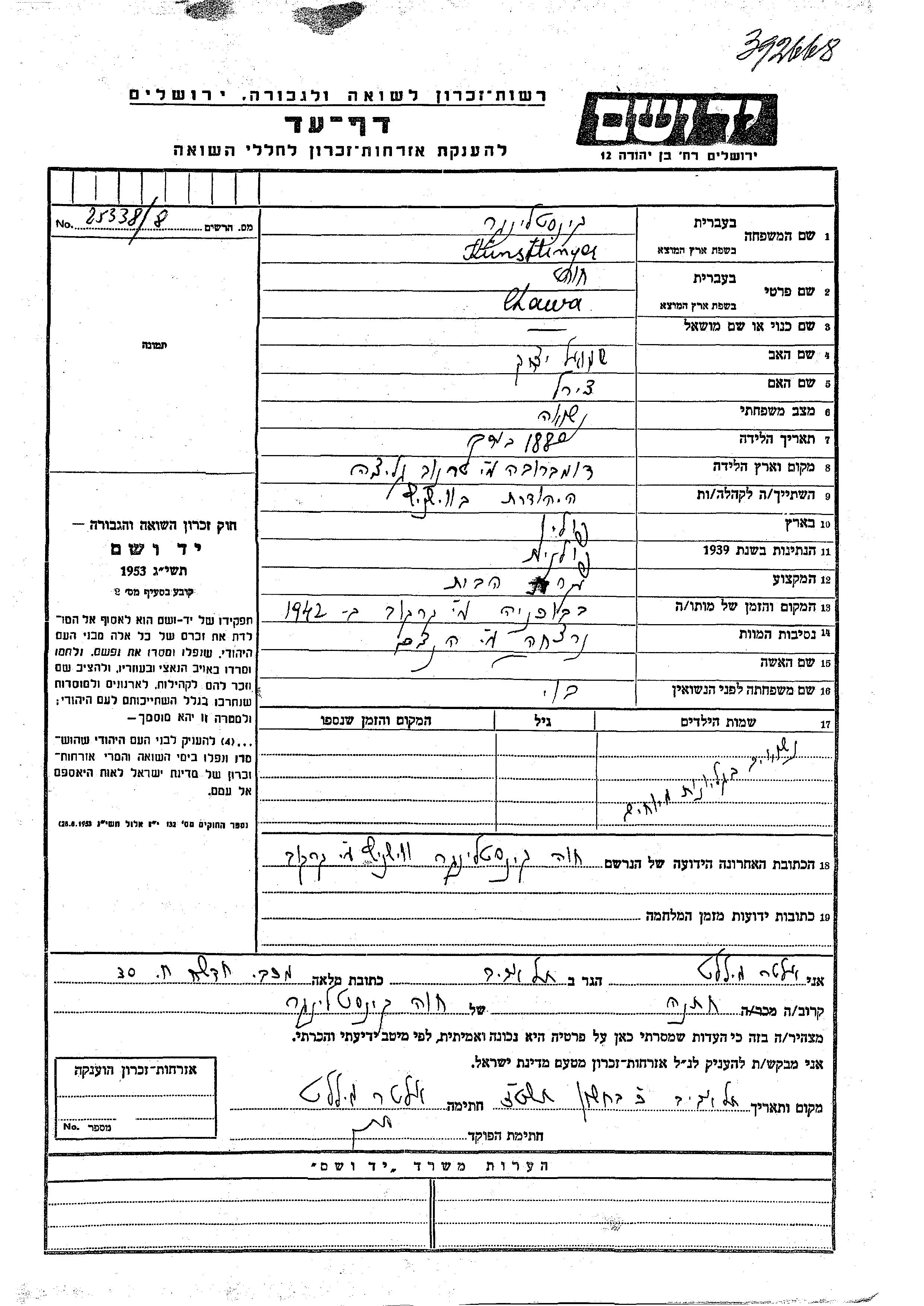Chawa wurde in der Schoah ermordet. Todesort: Bochnia, Polen im Jahr 1942.
