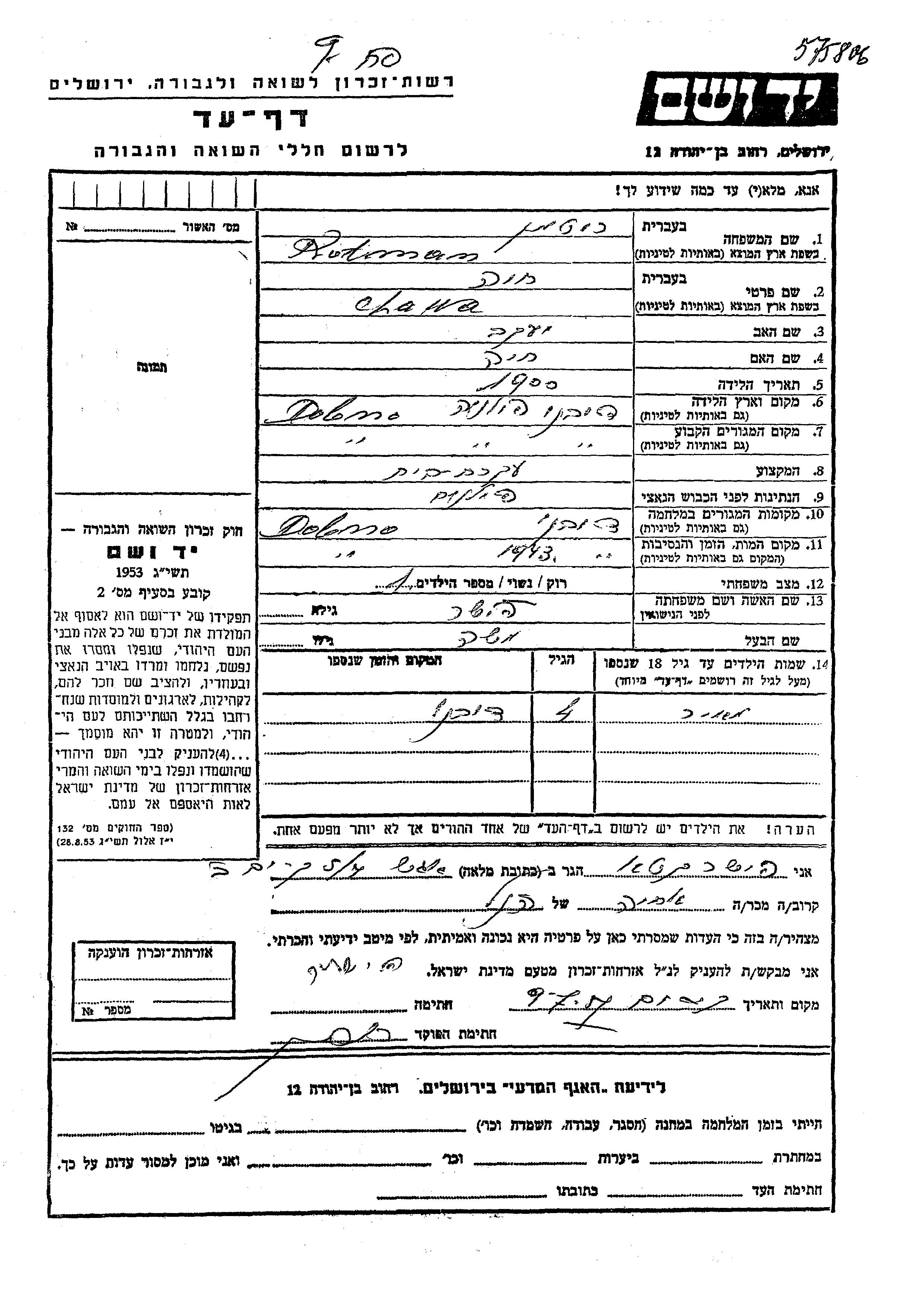 Rotman Chawa 1900 Dobno, Polen Gedenkblatt