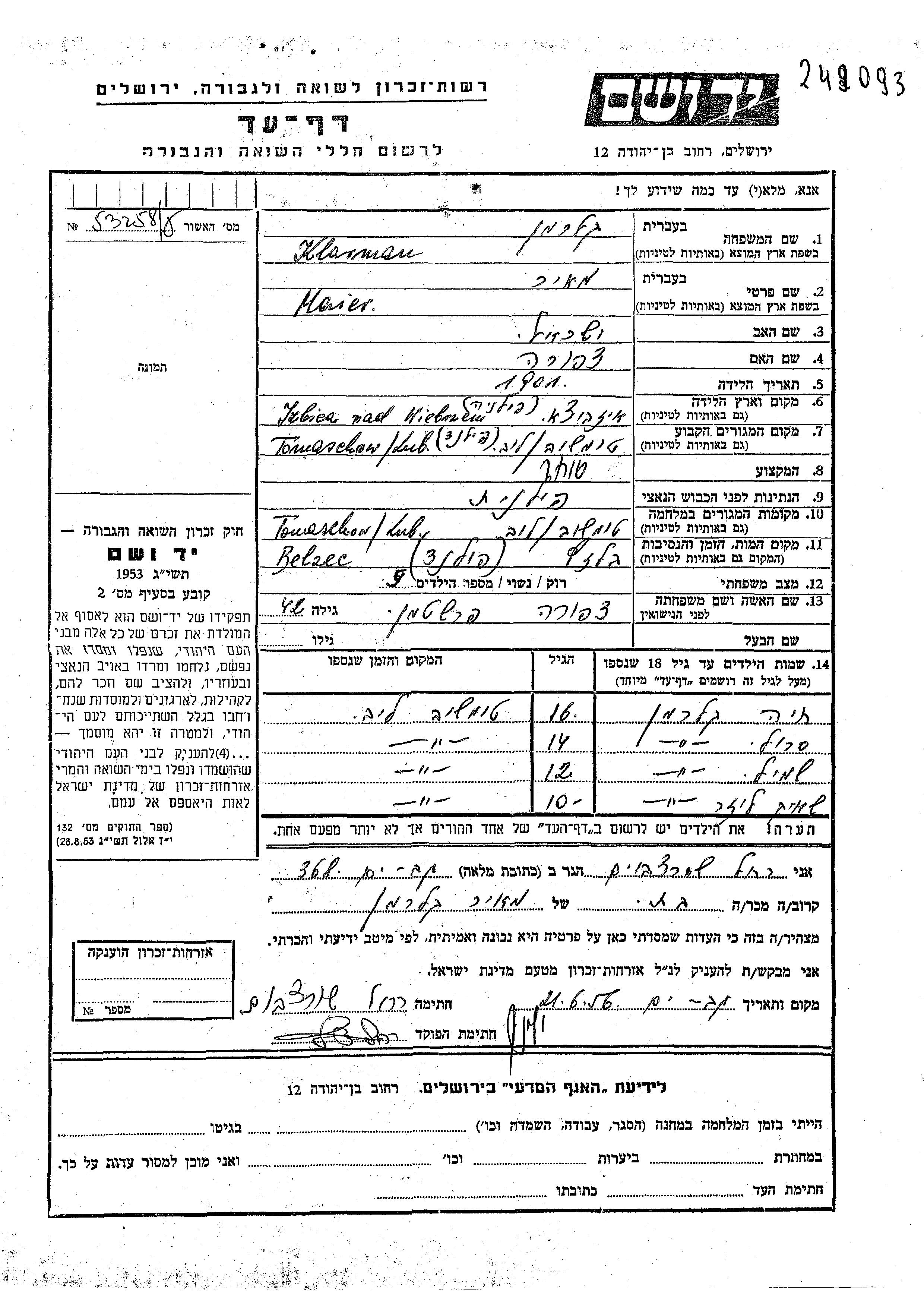 Meir Klarman Kelerman wurde im Jahr 1901 in Izbica, Polen geboren. Er war der Sohn von Yisrael und Tzipora. Er war Kaufmann/-frau und mit Tzipora, geb. Fershtman Verheiratet. Vor dem Zweiten Weltkrieg lebte er in Tomaszow Lubelski, Polen. Während des Krieges war er in Tomaszow Lubelski, Polen.