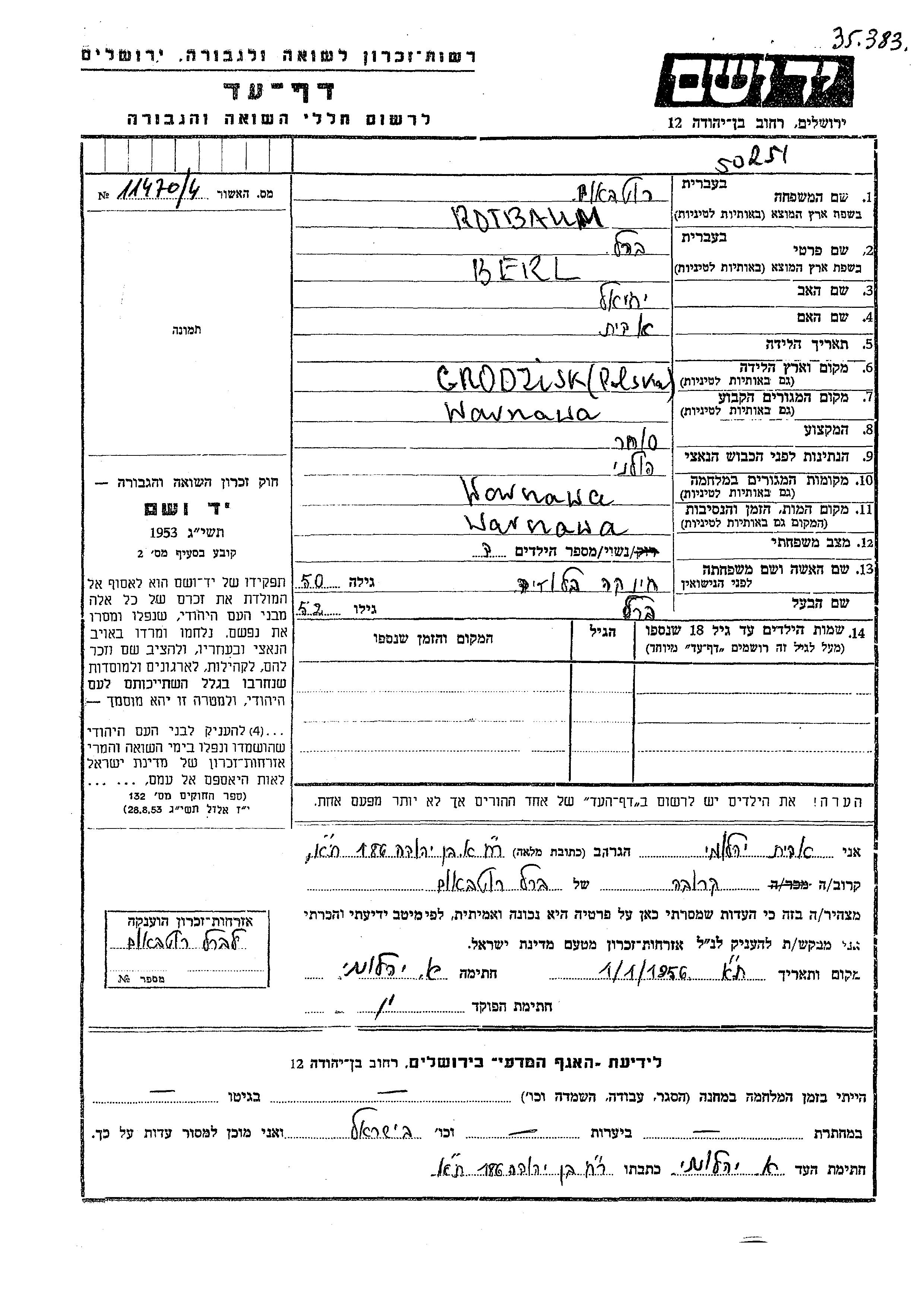 Berl Rotbaum wurde in Grodzisk, Polen geboren. Er war der Sohn von Yekhiel und Edit. Er war Kaufmann/-frau und mit Khinke, geb. Bluzeid Verheiratet. Vor dem Zweiten Weltkrieg lebte er in Warszawa, Polen. Während des Krieges war er in Warszawa, Polen.