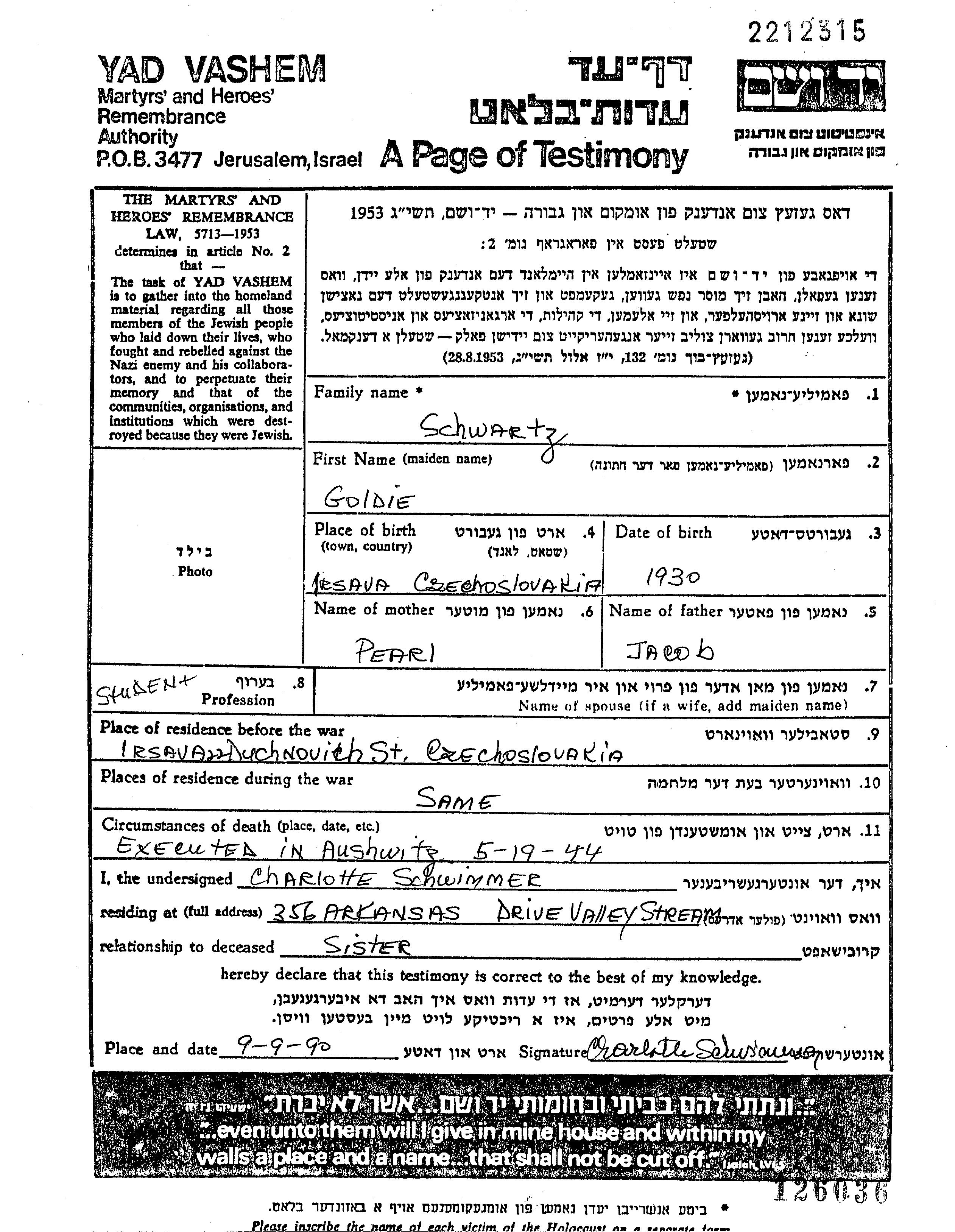 Goldie Schwartz wurde im Jahr 1930 in Irsava, Tschechoslowakei geboren. Sie war Schüler/-in. Vor dem Zweiten Weltkrieg lebte sie in Irsava, Tschechoslowakei.