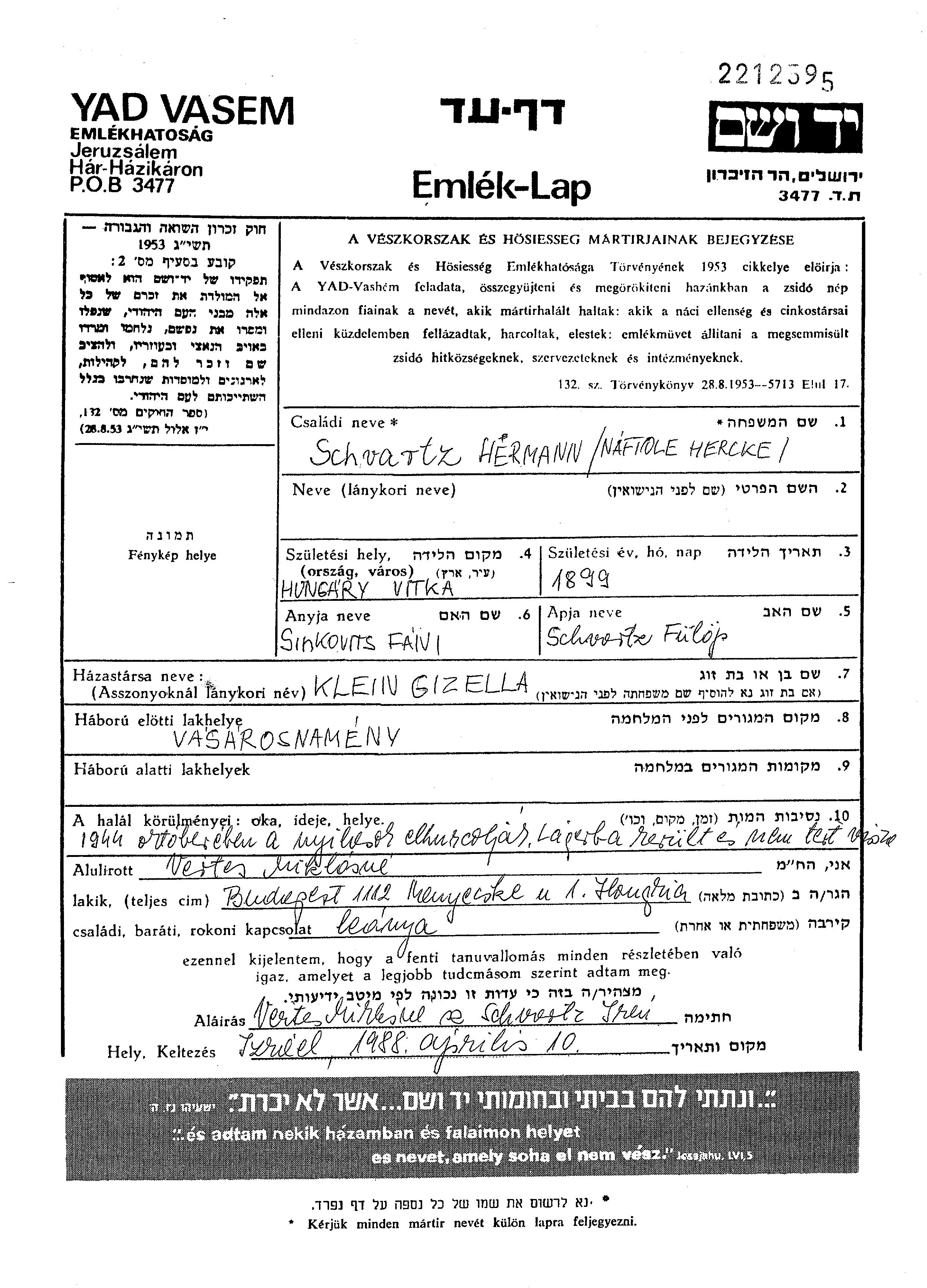 Hermann Hercke Schvartz wurde im Jahr 1896 in Vitka, Ungarn geboren. Vor dem Zweiten Weltkrieg lebte er in Vasarosnameny, Ungarn.