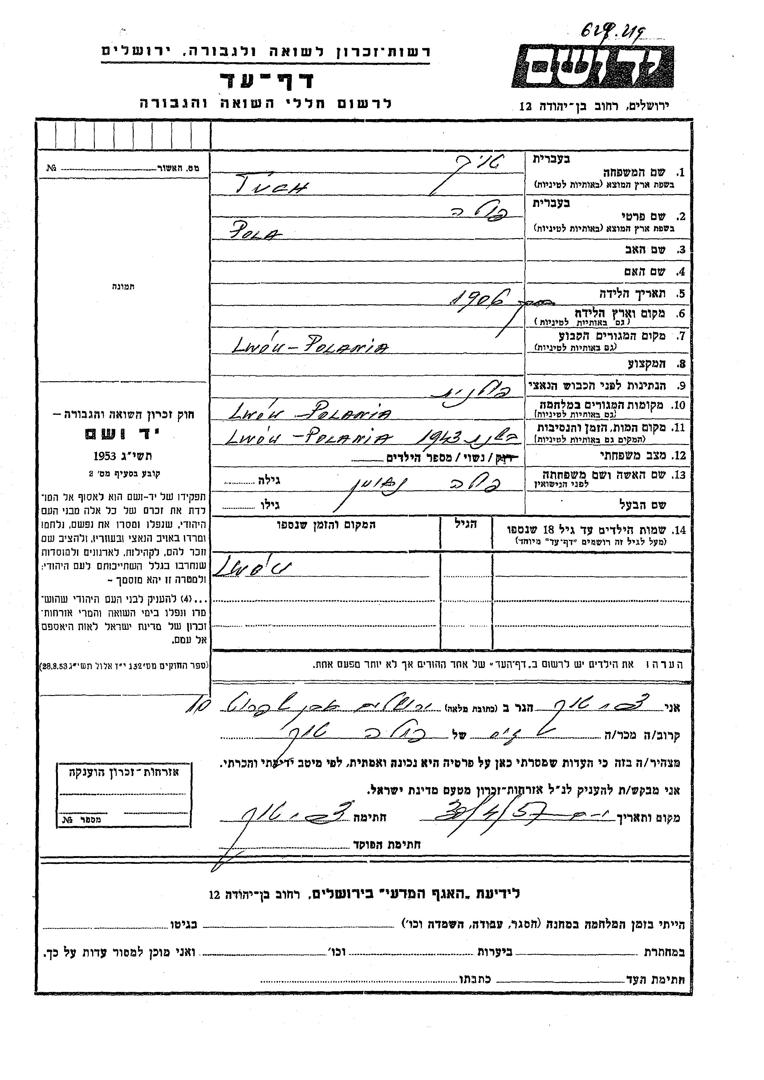 Pola Tuch, geb. Noiman wurde im Jahr 1906 geboren. Sie war Verheiratet. Vor dem Zweiten Weltkrieg lebte sie in Lwow, Polen. Während des Krieges war sie in Lwow, Polen.