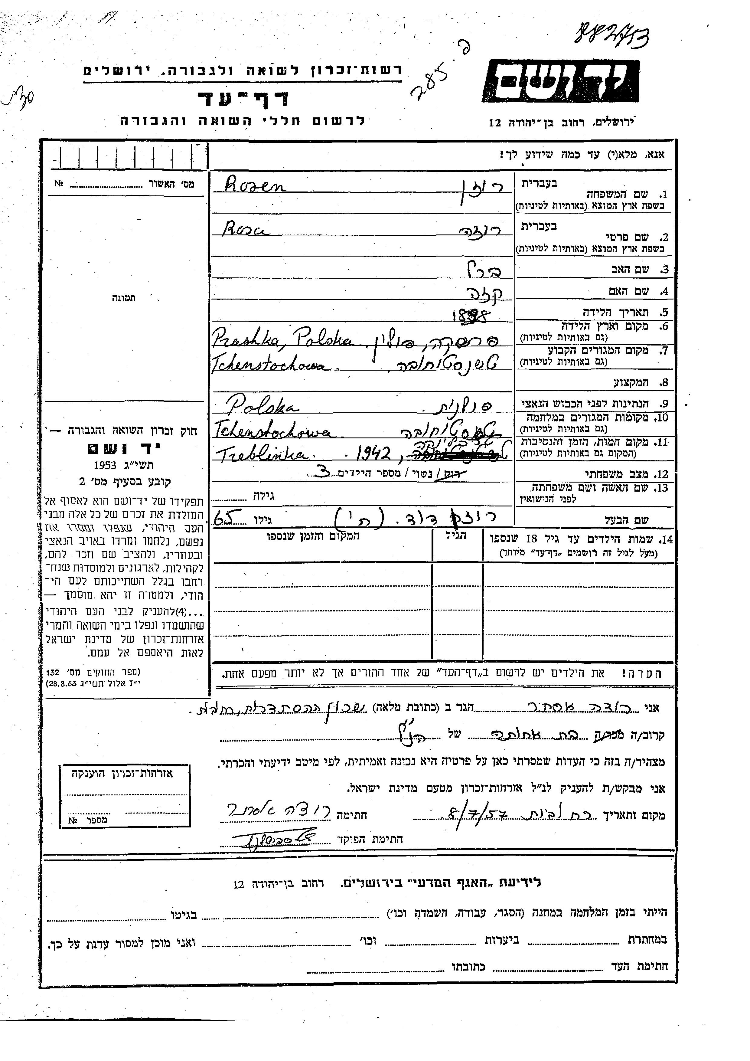 Roza Rosen wurde im Jahr 1898 in Prashka, Polen geboren. Sie war die Tochter von Berl und Kaza. Sie war mit David Verheiratet. Vor dem Zweiten Weltkrieg lebte sie in Tchenstochowa, Polen. Während des Krieges war sie in Tchenstochowa, Polen.