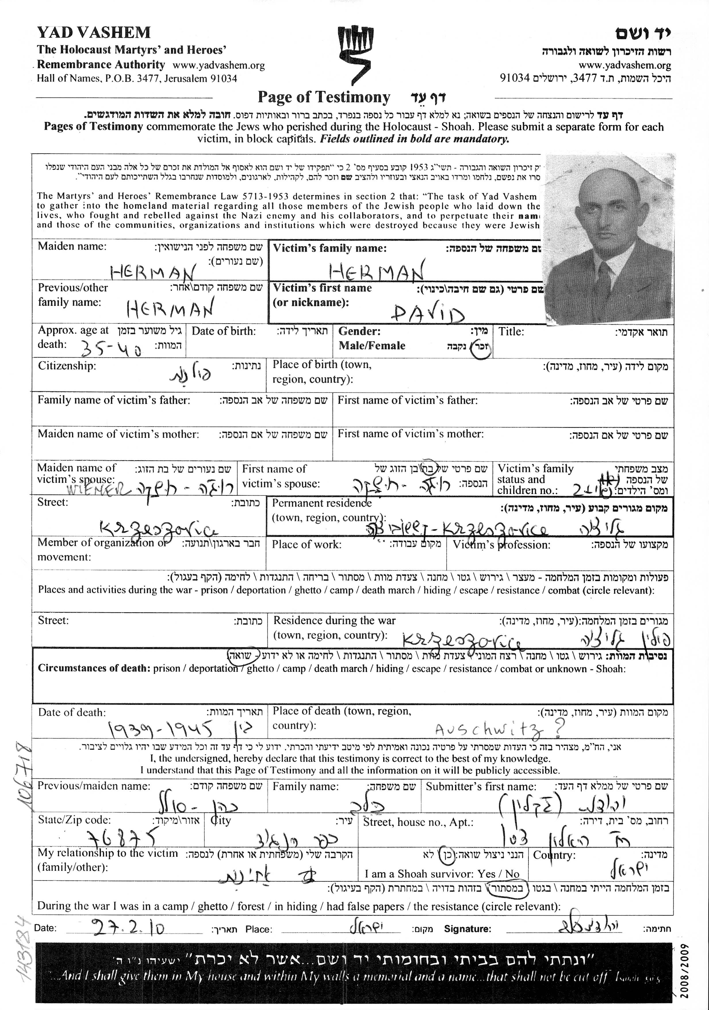 David Herman. Vor dem Zweiten Weltkrieg lebte er in Krzeszowice, Polen.