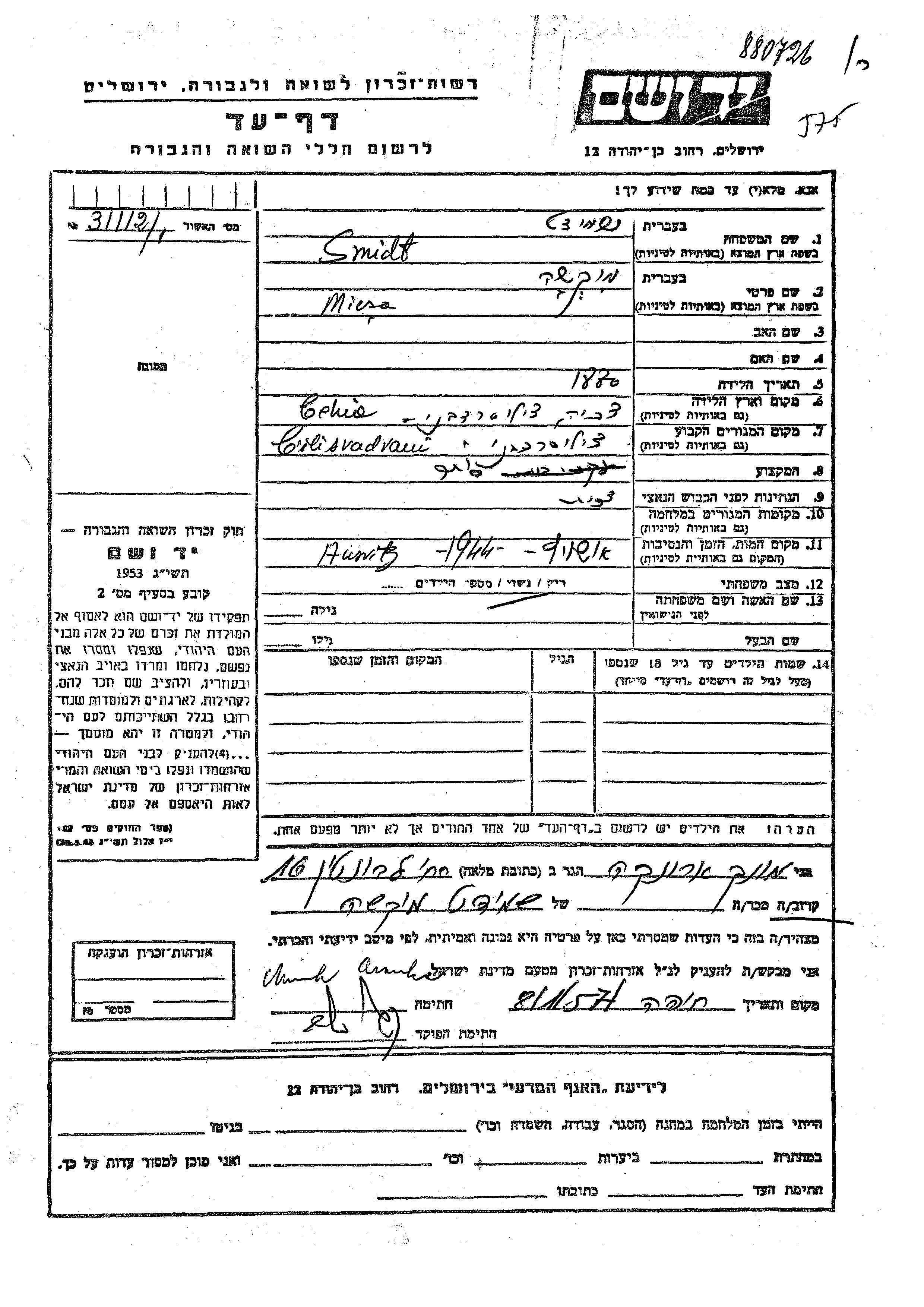 Micsa Smidt wurde im Jahr 1880 in Ciliska Radvan, Tschechoslowakei geboren. Er war Kaufmann/-frau und Verheiratet. Vor dem Zweiten Weltkrieg lebte er in Ciliska Radvan, Tschechoslowakei.