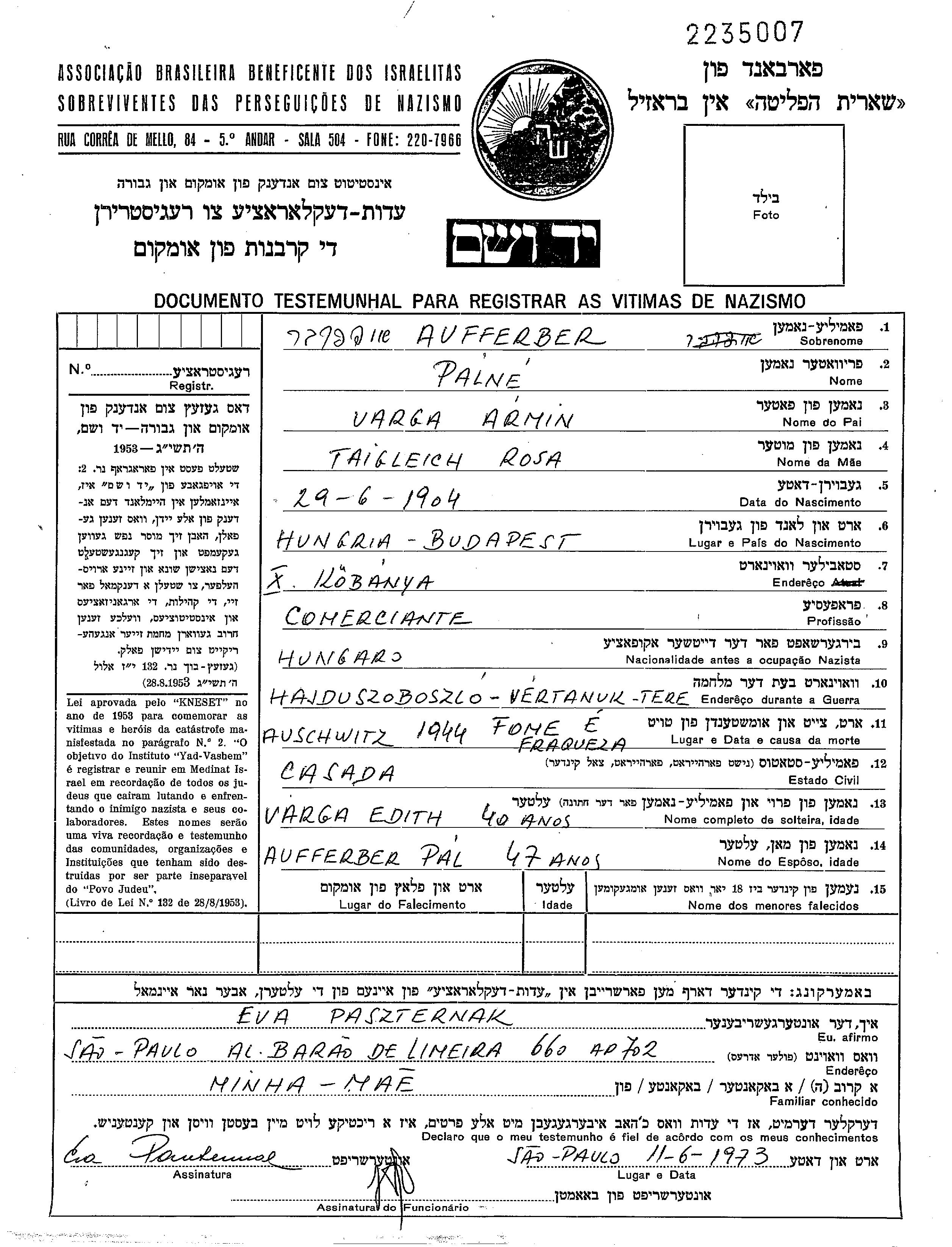 Edith Aufferber, geb. Varga wurde im Jahr 1904 in Budapest, Ungarn geboren. Sie war Kaufmann/-frau. Vor dem Zweiten Weltkrieg lebte sie in Hajduszoboszlo, Ungarn.