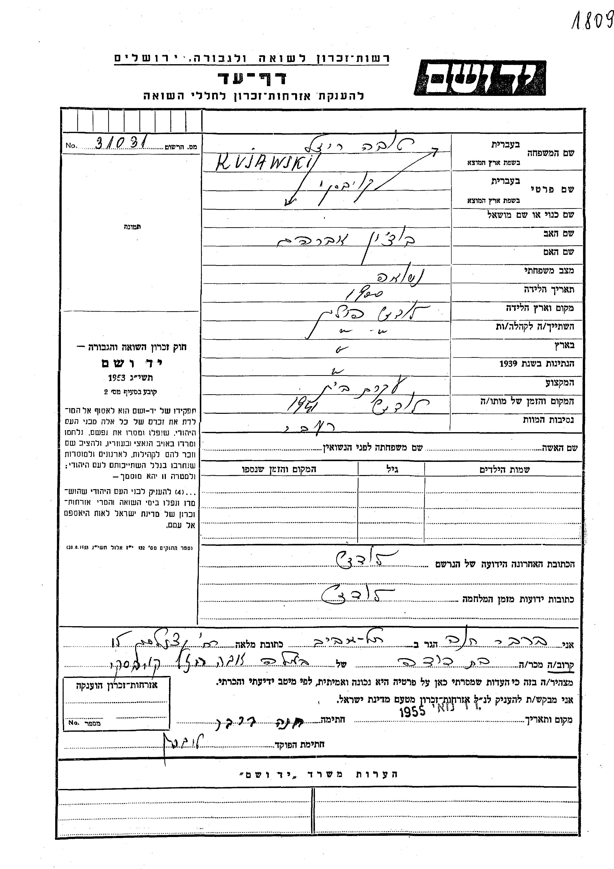 Tova Reizel Kujawski, geb. Bochin wurde im Jahr 1900 in Lodz, Polen geboren. Sie war die Tochter von Avraham. Sie war Hausfrau. Vor dem Zweiten Weltkrieg lebte sie in Lodz, Polen. Während des Krieges war sie in Lodz, Polen.