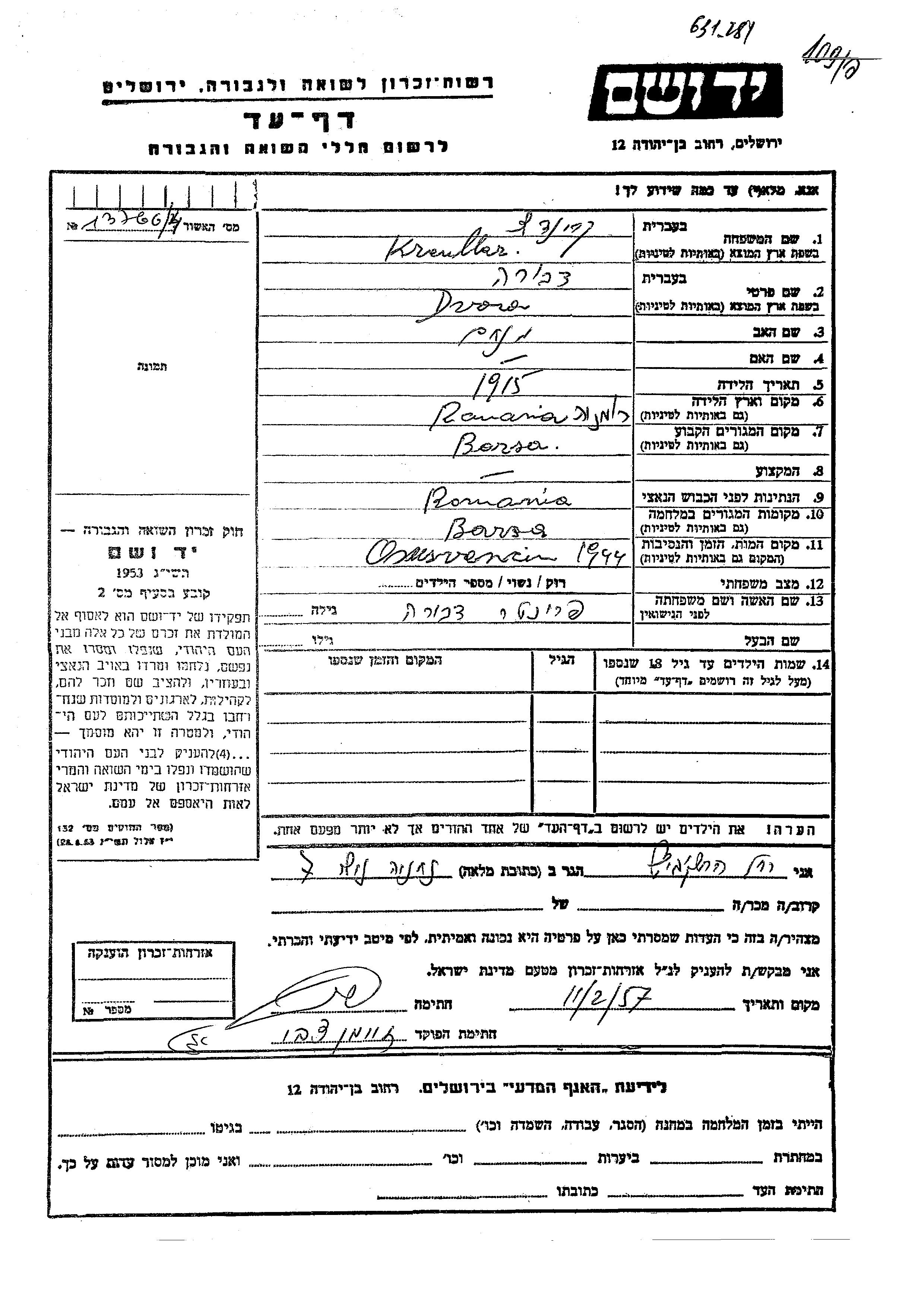 Dvora Krendler, geb. Frukhter wurde im Jahr 1915 in Rumänien geboren. Sie war die Tochter von Menakhem. Vor dem Zweiten Weltkrieg lebte sie in Borsa, Rumänien. Während des Krieges war sie in Borsa, Rumänien.