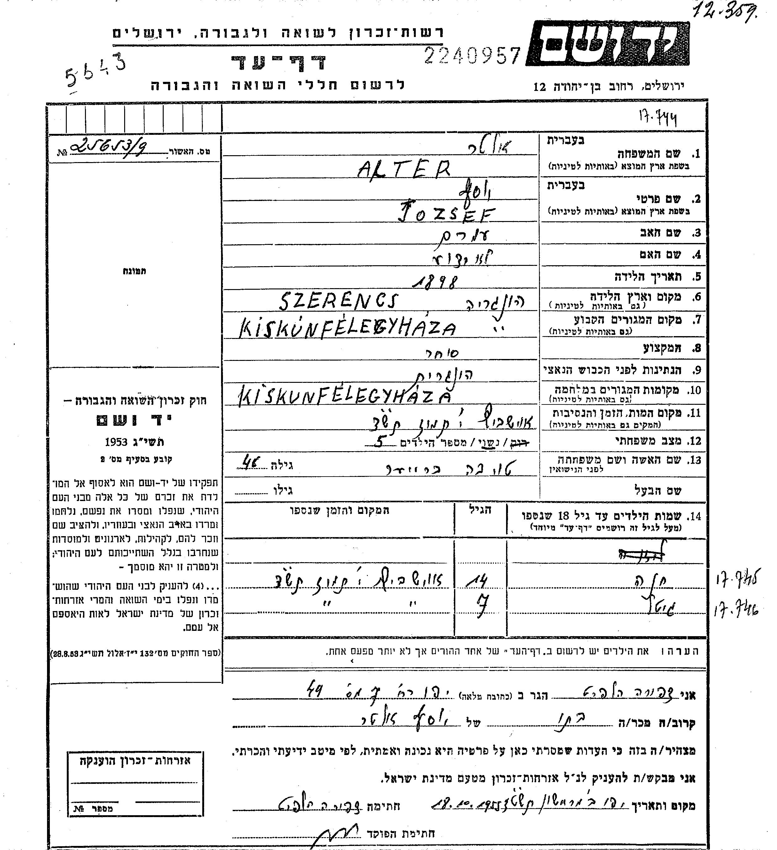 Jozsef Alter wurde im Jahr 1896 in Szerencs, Ungarn geboren. Er war Kaufmann/-frau. Vor dem Zweiten Weltkrieg lebte er in Kiskunfelegyhaza, Ungarn.