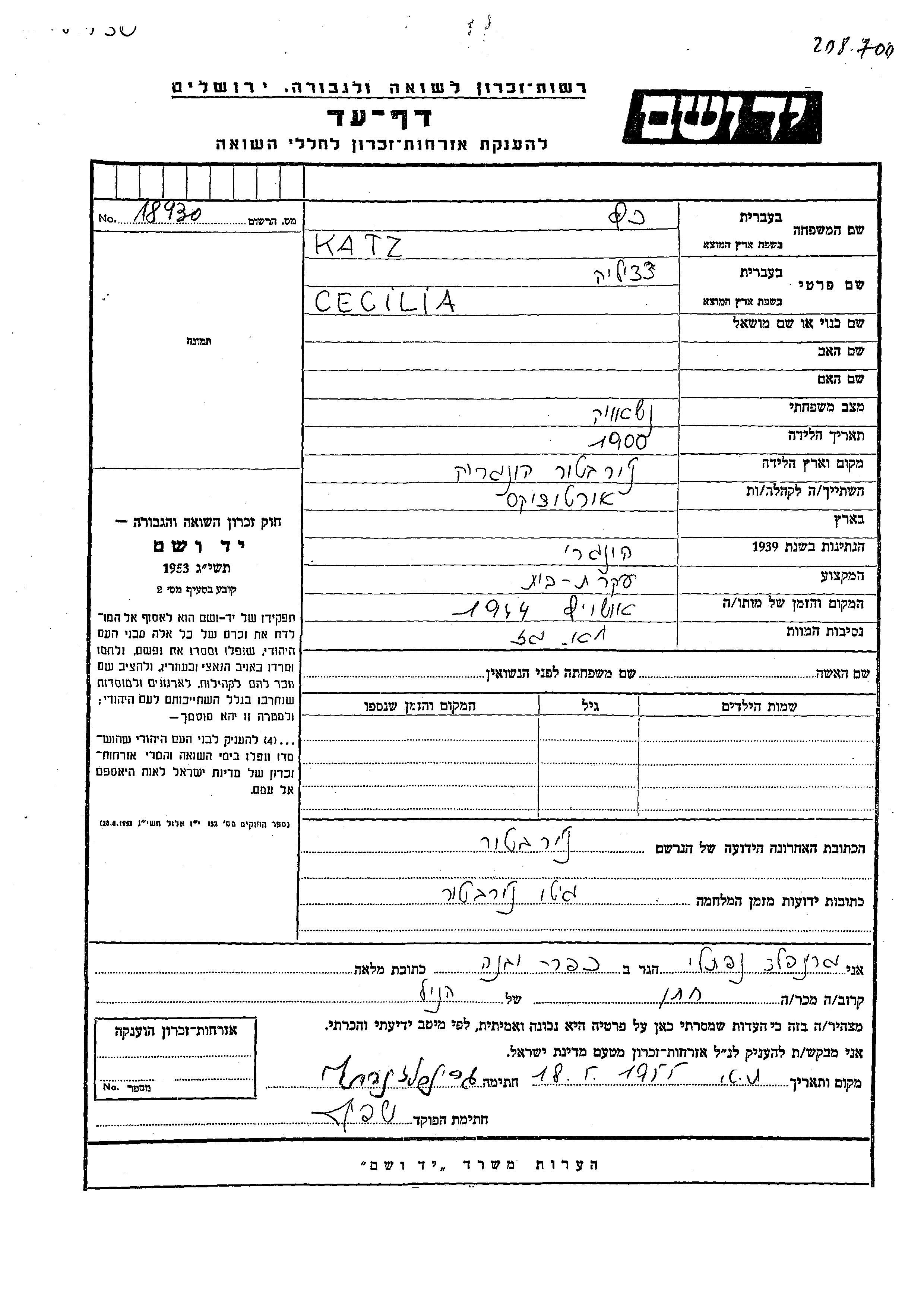 Cecilia Katz wurde im Jahr 1900 in Nyirbator, Ungarn geboren. Sie war Hausfrau und Verheiratet. Vor dem Zweiten Weltkrieg lebte sie in Nyirbator, Ungarn. Während des Krieges war sie in Nyirbator, Ungarn.