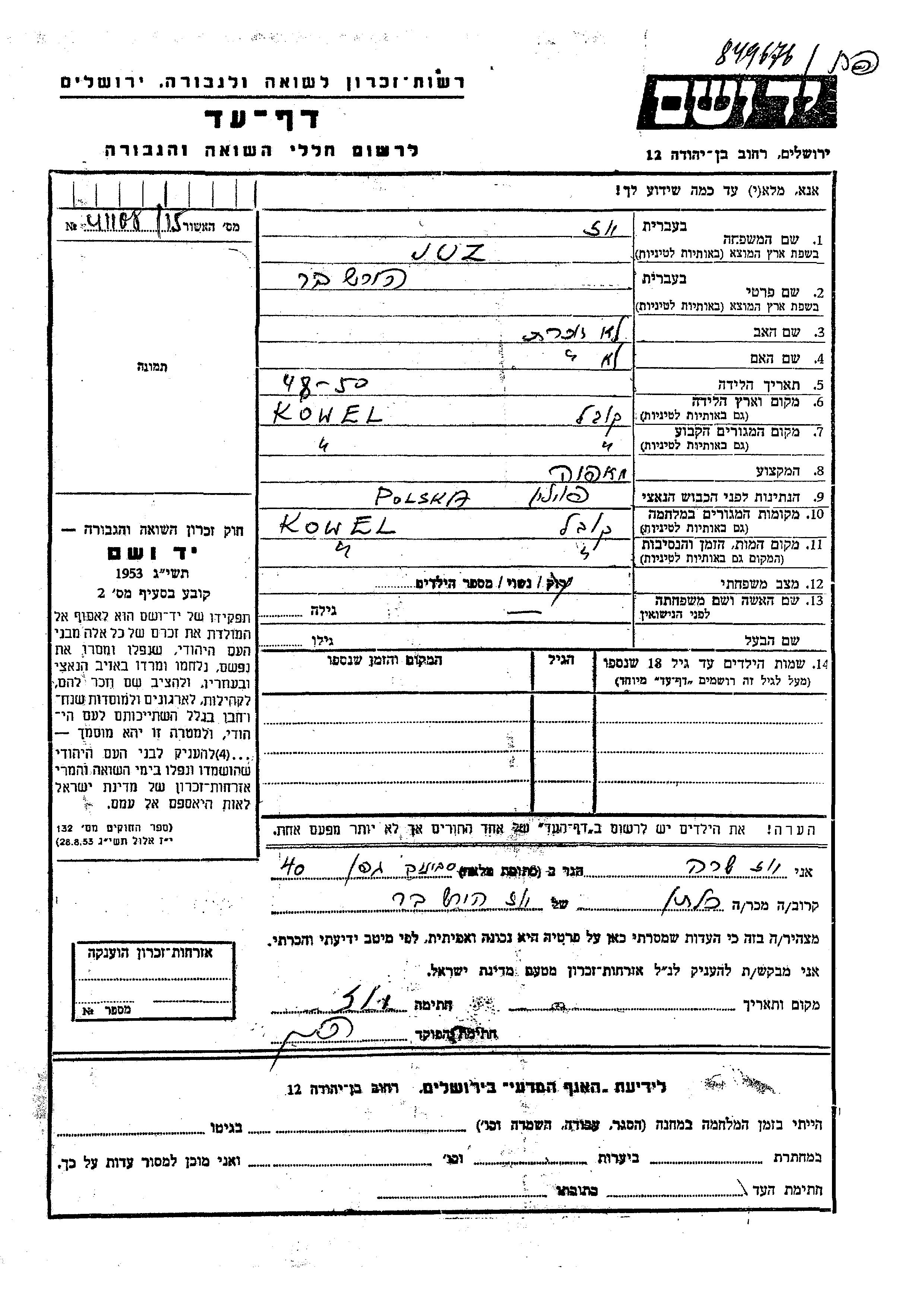 Hirsh Ber Juz wurde im Jahr 1848 in Kowel, Polen geboren. Er war Bäcker/-in und Verheiratet. Vor dem Zweiten Weltkrieg lebte er in Kowel, Polen. Während des Krieges war er in Kowel, Polen.