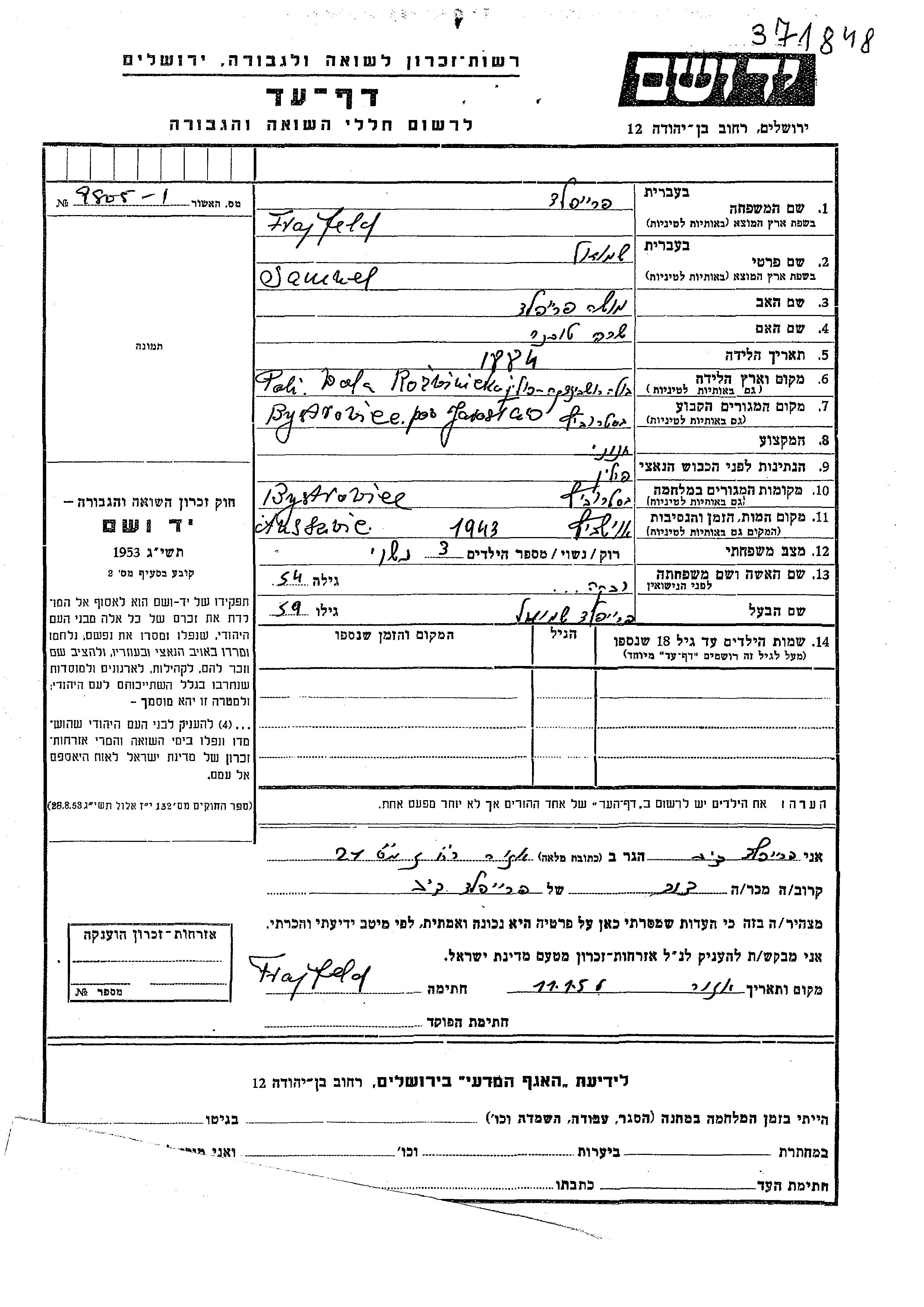 Shmuel Frajfeld wurde im Jahr 1884 in Rozaneczki, Polen geboren. Er war der Sohn von Moshe und Sara. Er war Lebensmittelhändler/-in und mit Rivka Verheiratet. Vor dem Zweiten Weltkrieg lebte er in Bystrowice, Polen. Während des Krieges war er in Bystrowice, Polen.