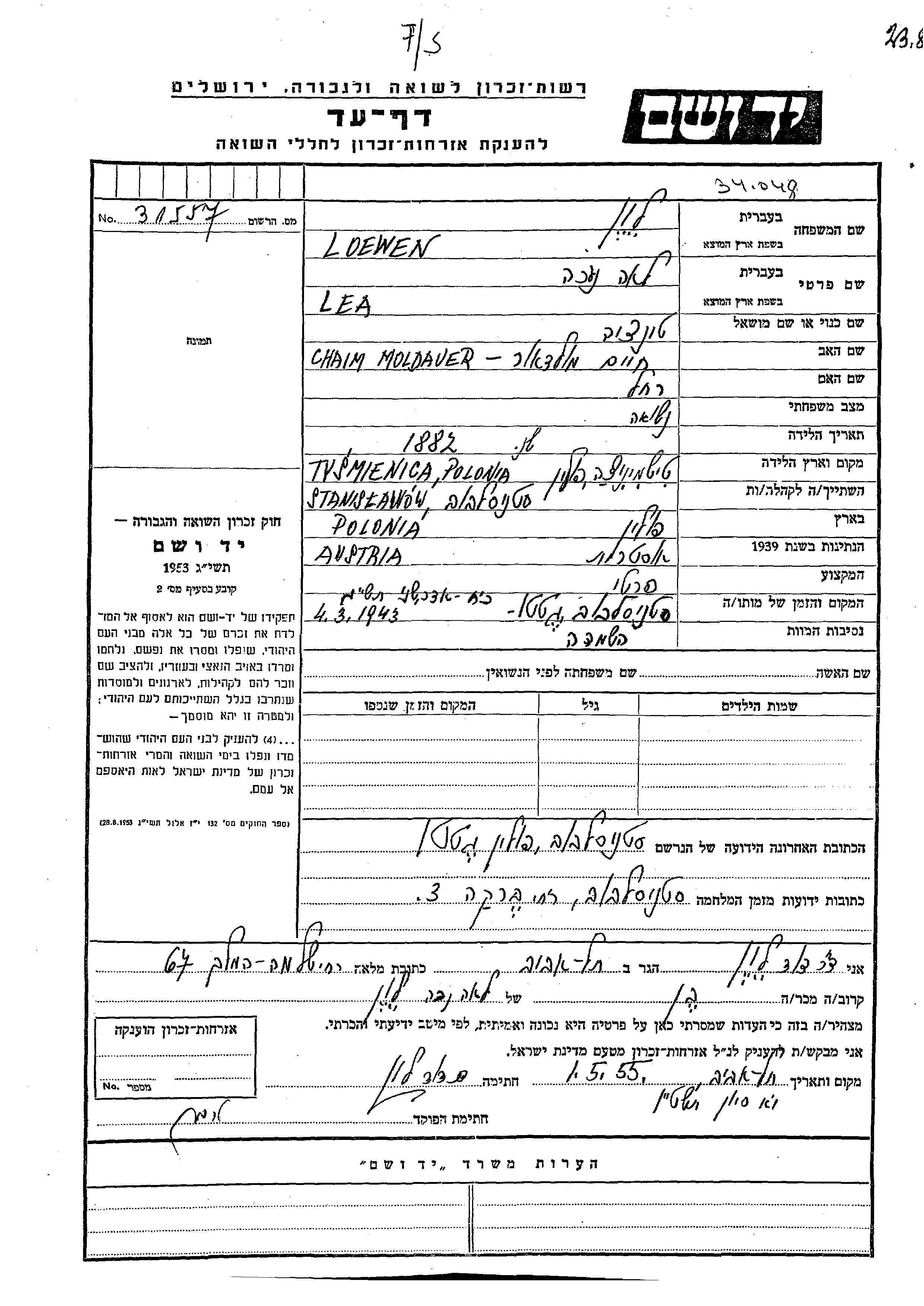 Lea Nekha Loewen, geb. Moldaver wurde im Jahr 1882 in Tysmienica, Polen geboren. Sie war die Tochter von Chaim und Rakhel. Sie war Selbständig und Verheiratet. Vor dem Zweiten Weltkrieg lebte sie in Stanislawow, Polen. Während des Krieges war sie in Stanislawow, Polen.