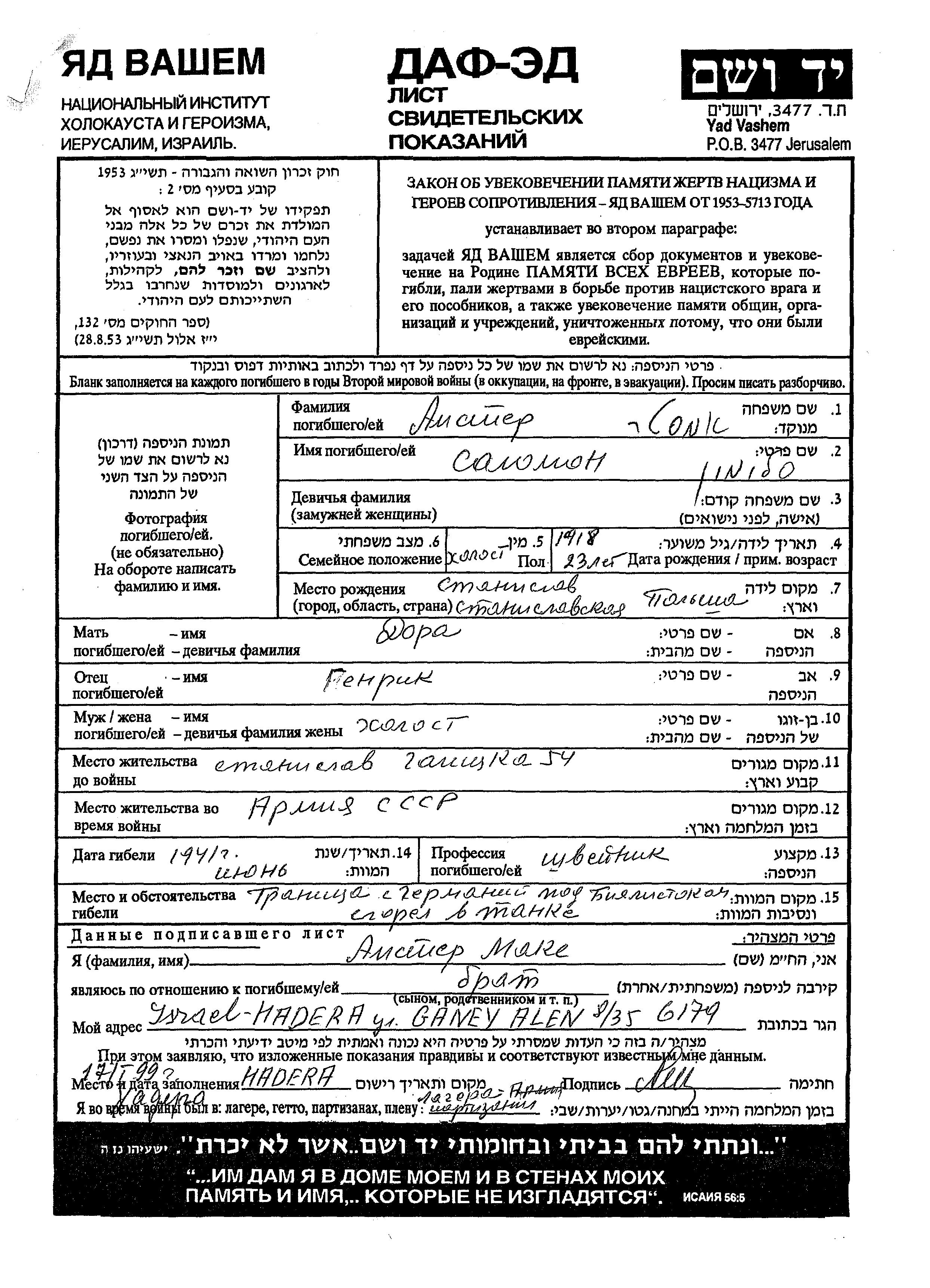 Salomon im Militärdienst umgekommen. Todesort: Bialystok, Polen im Jahr 06/1941.