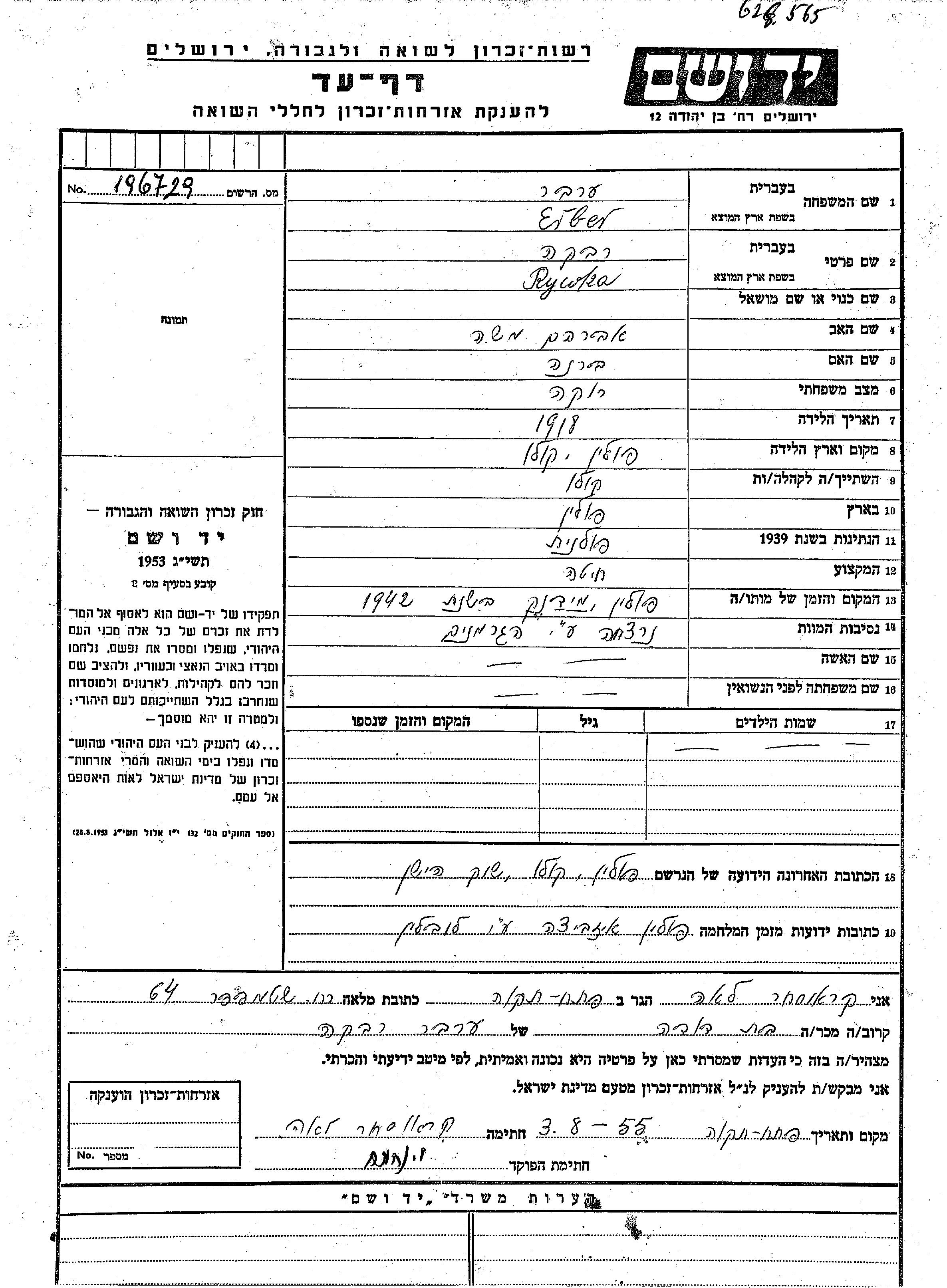 Rywka wurde in der Schoah ermordet. Todesort: Majdanek, Polen im Jahr 1942.