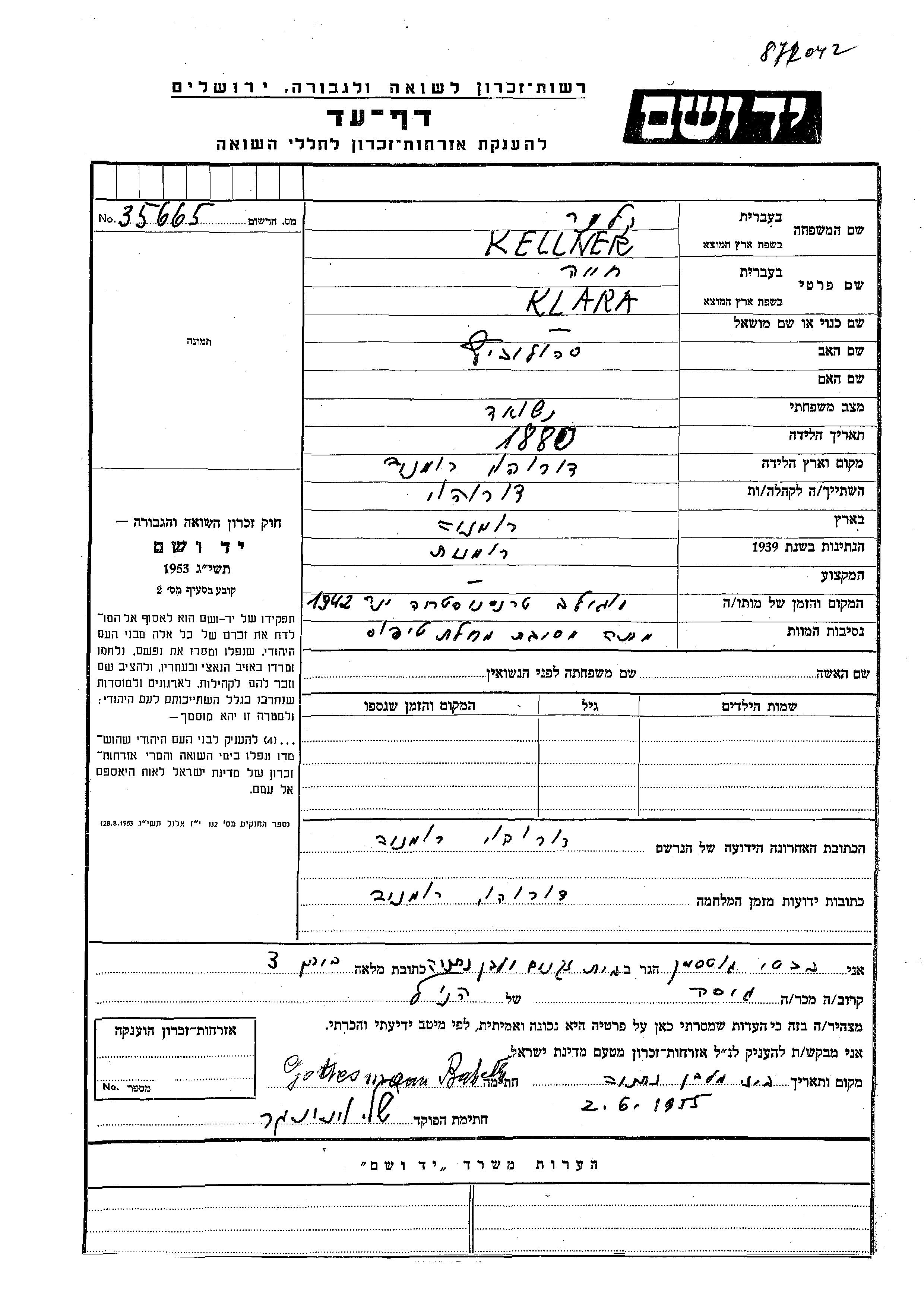 Khaia Klara Kellner Klaner, geb. Srolovitz wurde im Jahr 1880 in Dorohoi, Rumänien geboren. Vor dem Zweiten Weltkrieg lebte sie in Dorohoi, Rumänien. Während des Krieges war sie in Dorohoi, Rumänien.