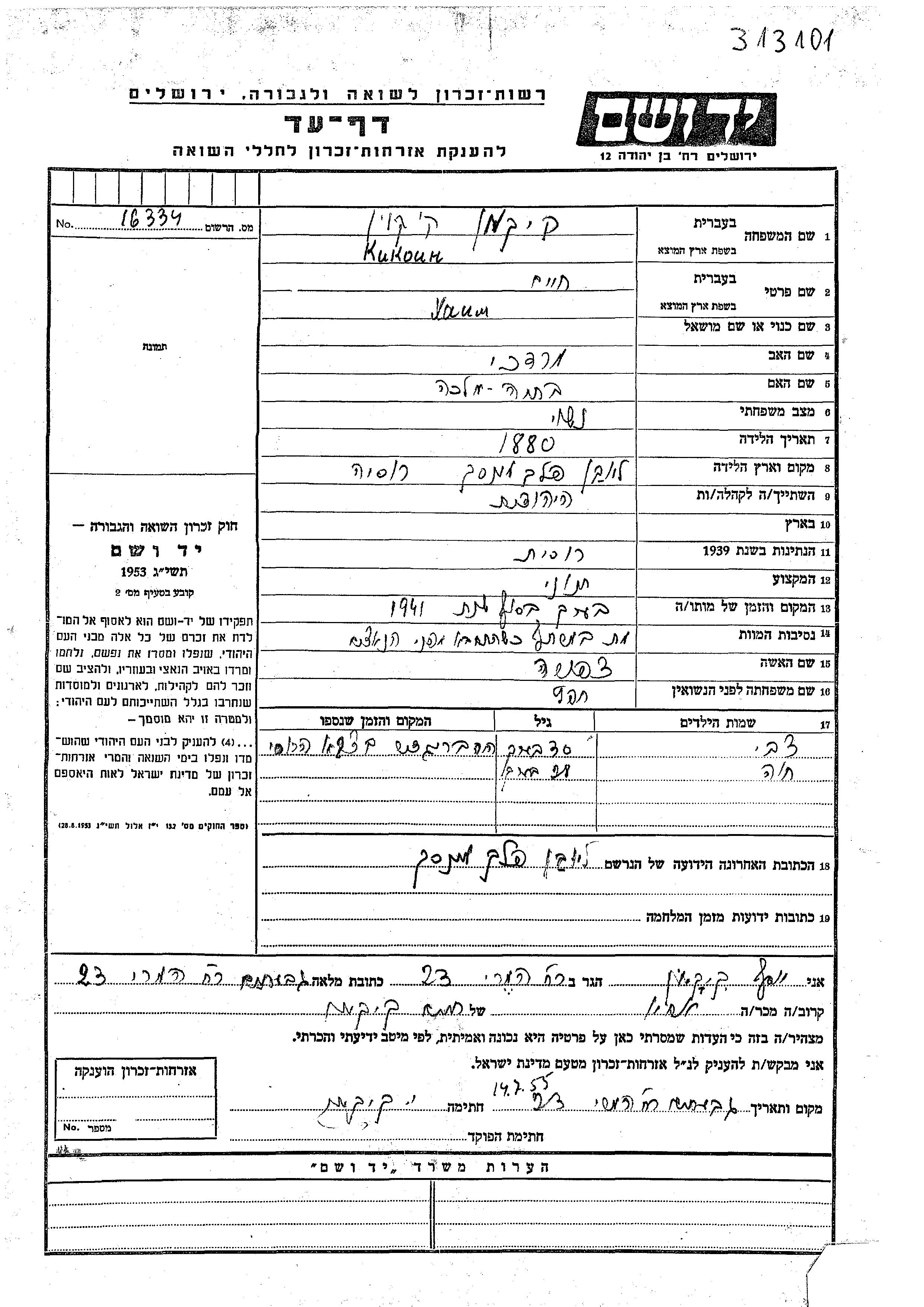 Chaim wurde in der Schoah ermordet. Todesort: unbekannt im Jahr 1941.