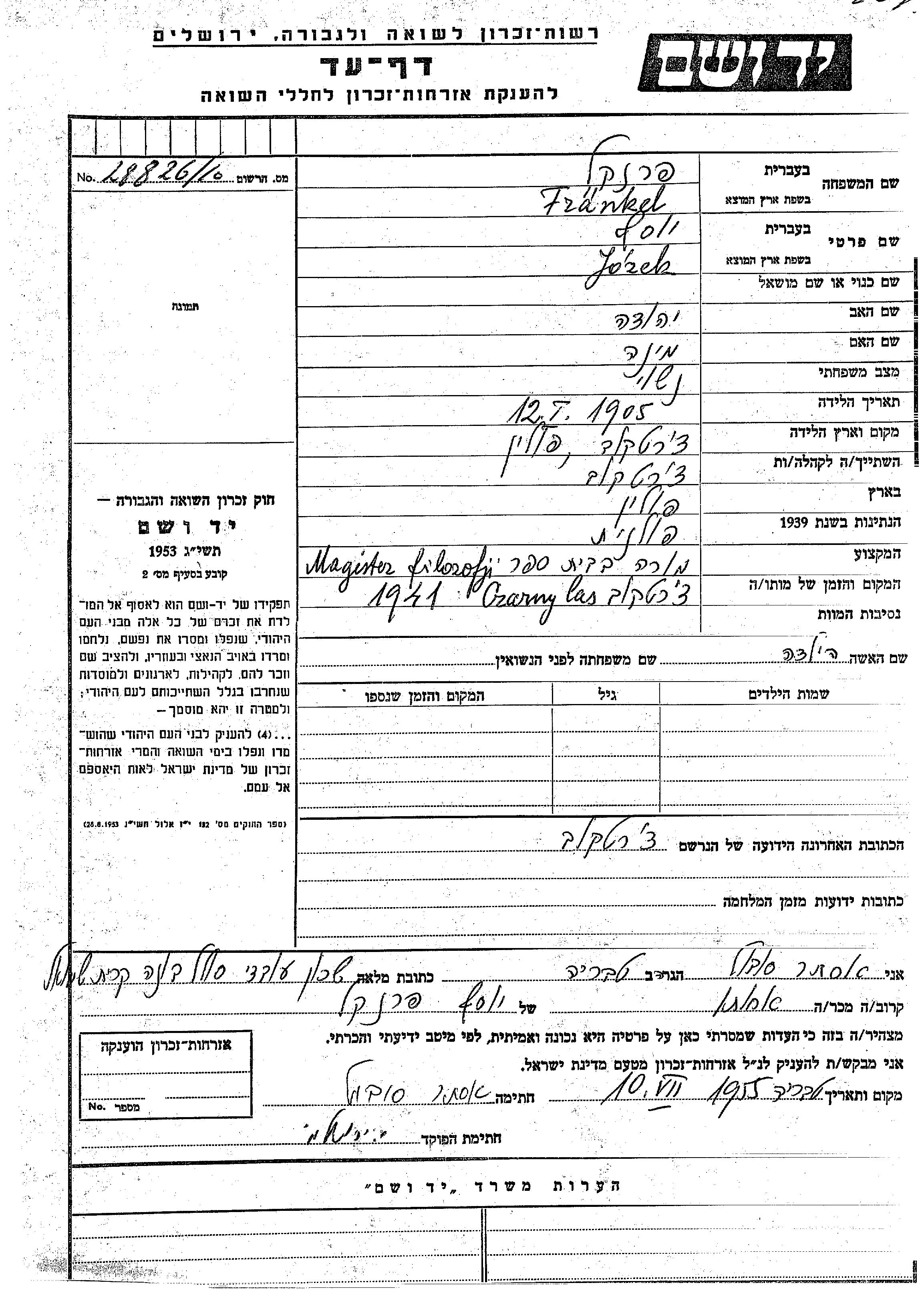Magister Jozek Frenkel wurde im Jahr 1905 in Czortkow, Polen geboren. Er war der Sohn von Yehuda und Mina. Er war Lehrer/in und mit Hilda Verheiratet. Vor dem Zweiten Weltkrieg lebte er in Czortkow, Polen. Während des Krieges war er in Czortkow, Polen.