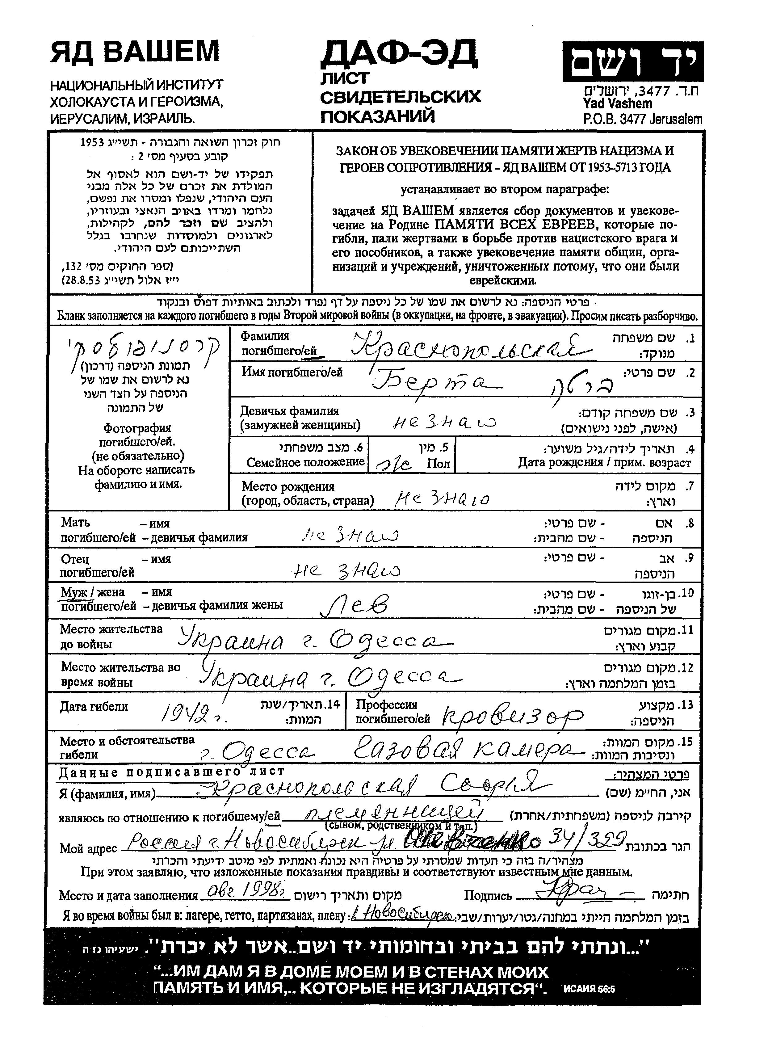 Berta Krasnopolskaya. Sie war Apotheker/-in. Vor dem Zweiten Weltkrieg lebte sie in Odessa, Ukraine (UdSSR). Während des Krieges war sie in Odessa, Ukraine (UdSSR).