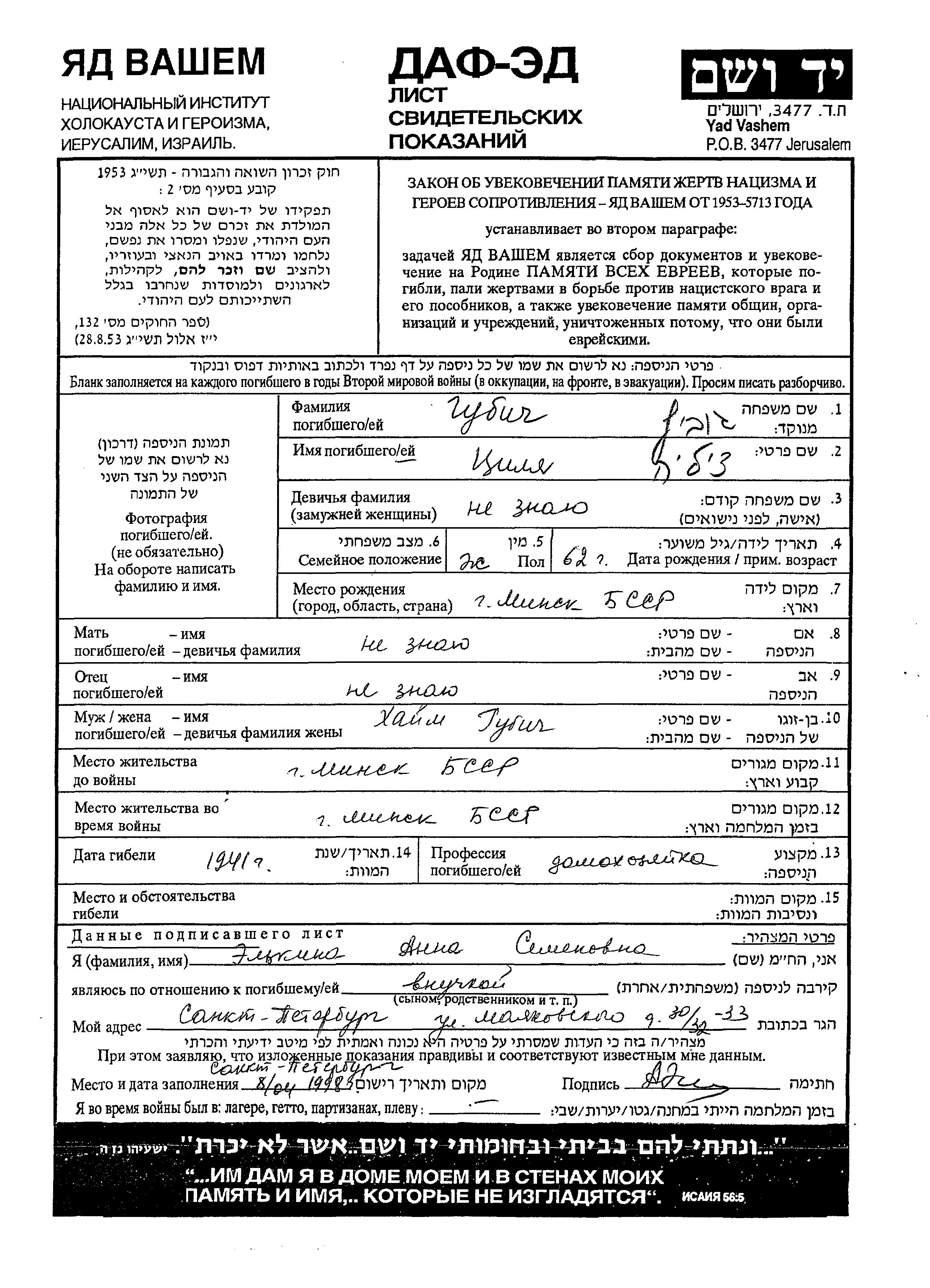 Tzilya Gubich wurde in Minsk, Weißrussland (UdSSR) geboren. Sie war Hausfrau und mit Khaim Verheiratet. Vor dem Zweiten Weltkrieg lebte sie in Minsk, Weißrussland (UdSSR). Während des Krieges war sie in Minsk, Weißrussland (UdSSR).