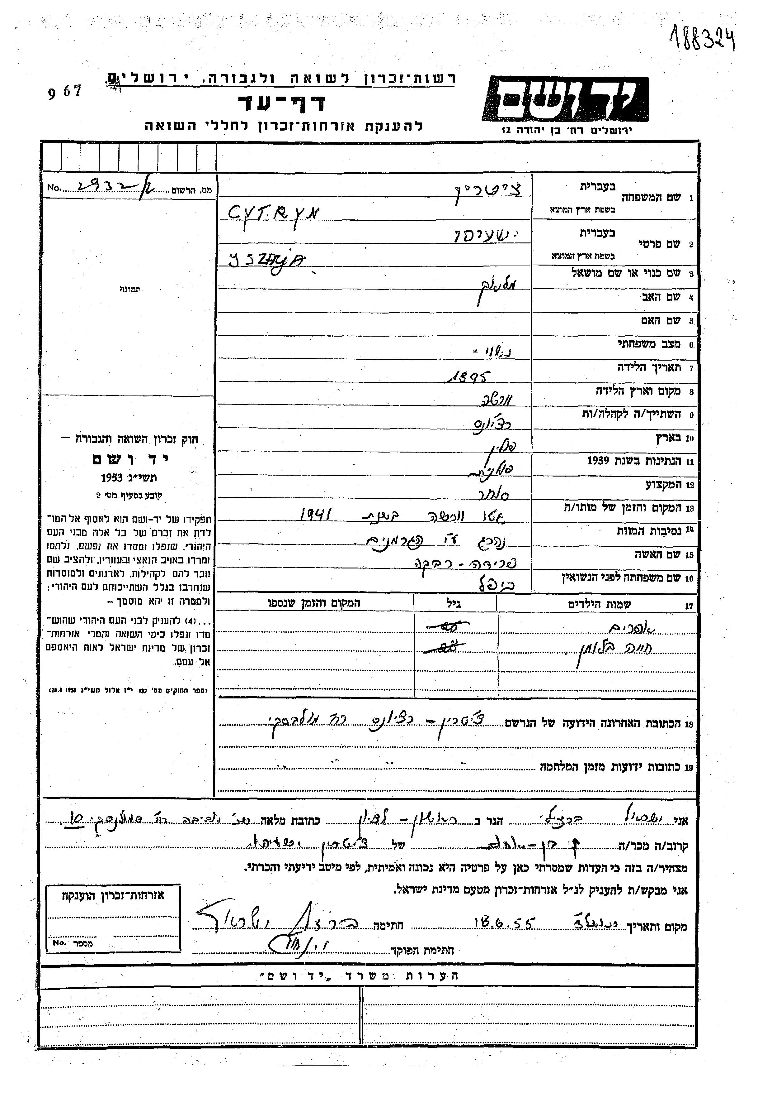 Yszaja Melekh Cytryn wurde im Jahr 1895 in Warsaw, Polen geboren. Er war Kaufmann/-frau und mit Frida Rivka, geb. Bifel Verheiratet.