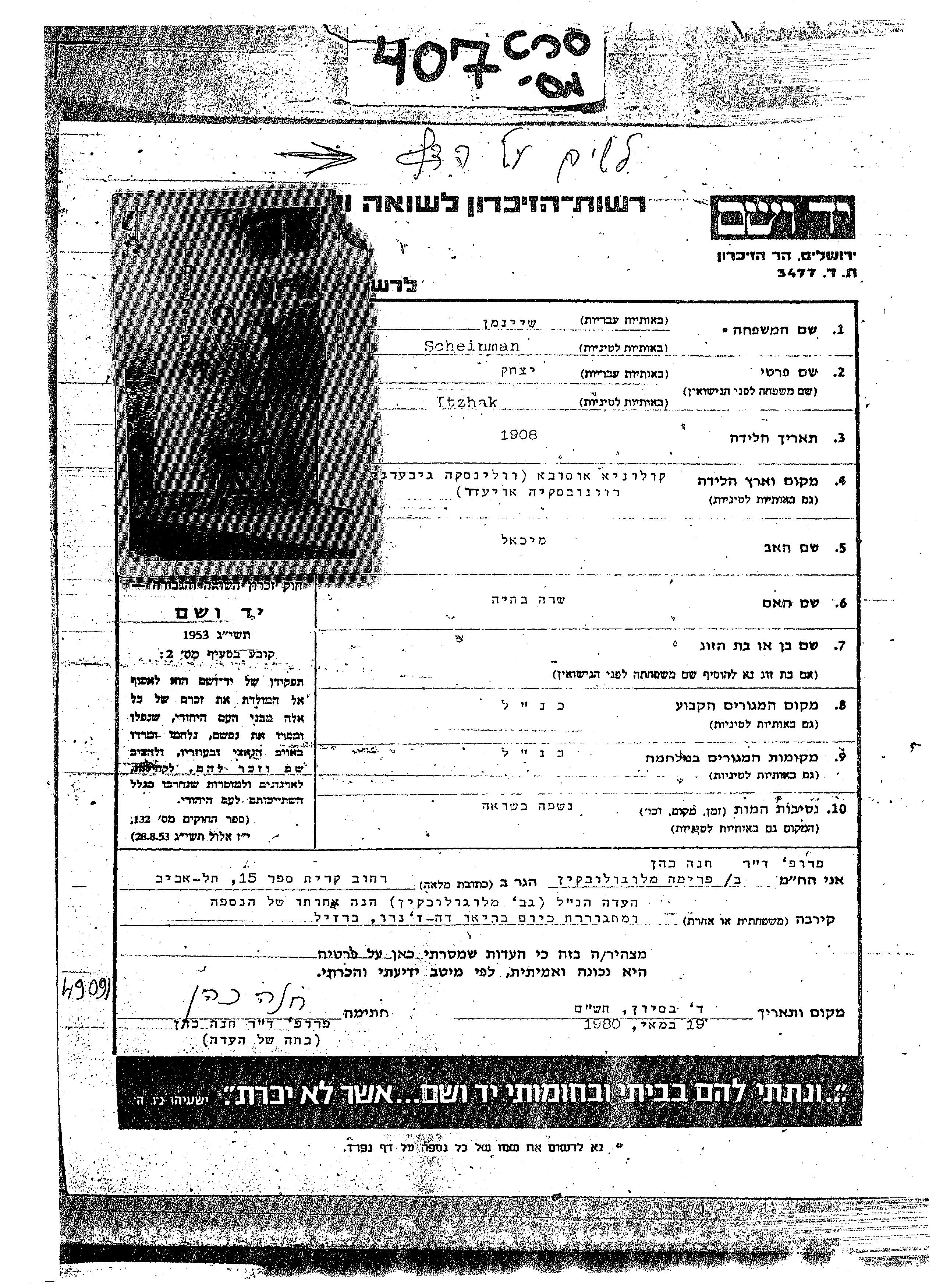 Scheinman Itzhak 1908 Osowa, Polen Gedenkblatt