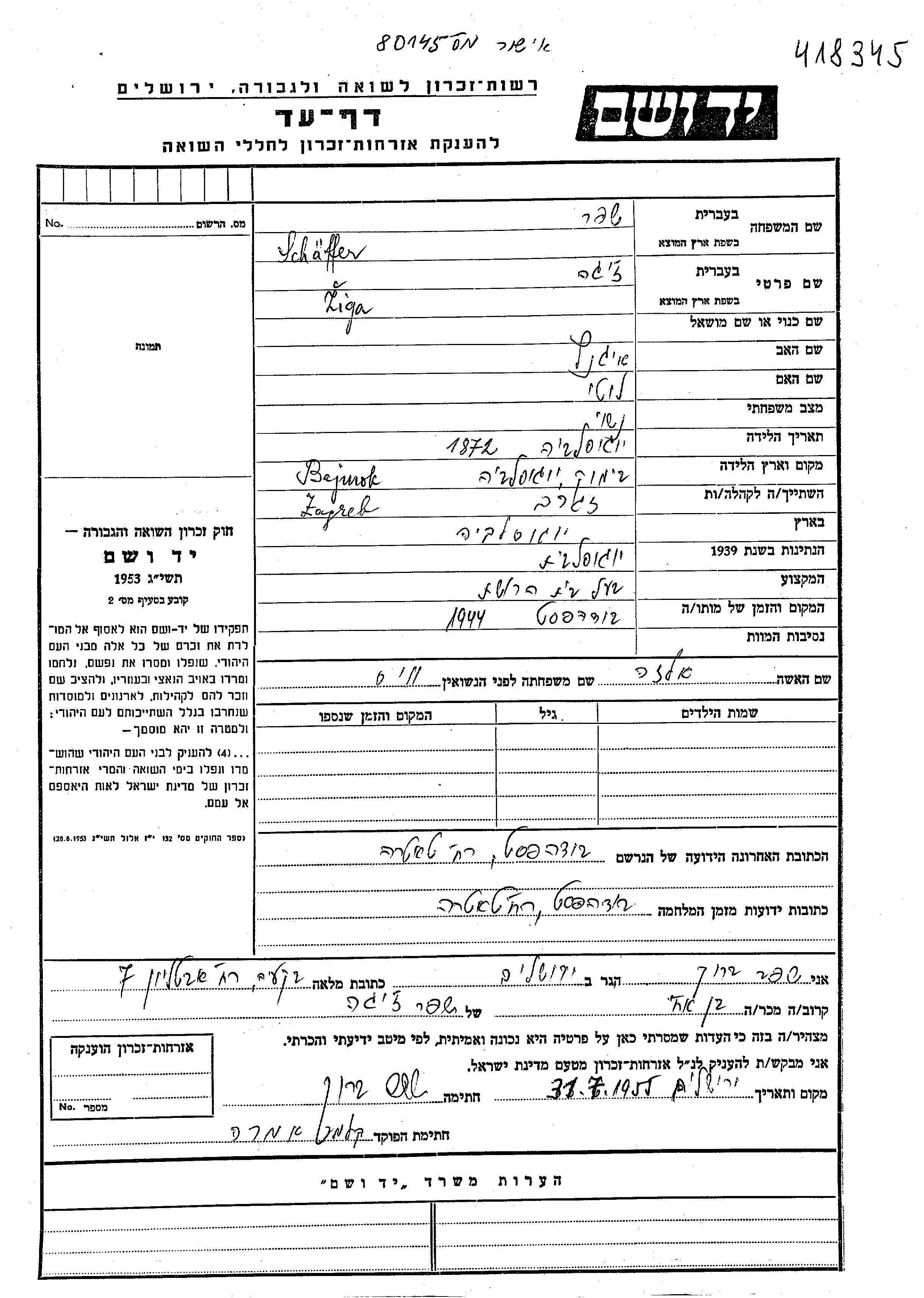 Ziga Schaffer wurde im Jahr 1872 in Bajmok, Jugoslawien geboren. Er war der Sohn von Ignatz und Loti. Er war Fabrikant/-in und mit Elza, geb. Vais Verheiratet. Vor dem Zweiten Weltkrieg lebte er in Zagreb, Jugoslawien. Während des Krieges war er in Budapest, Ungarn.