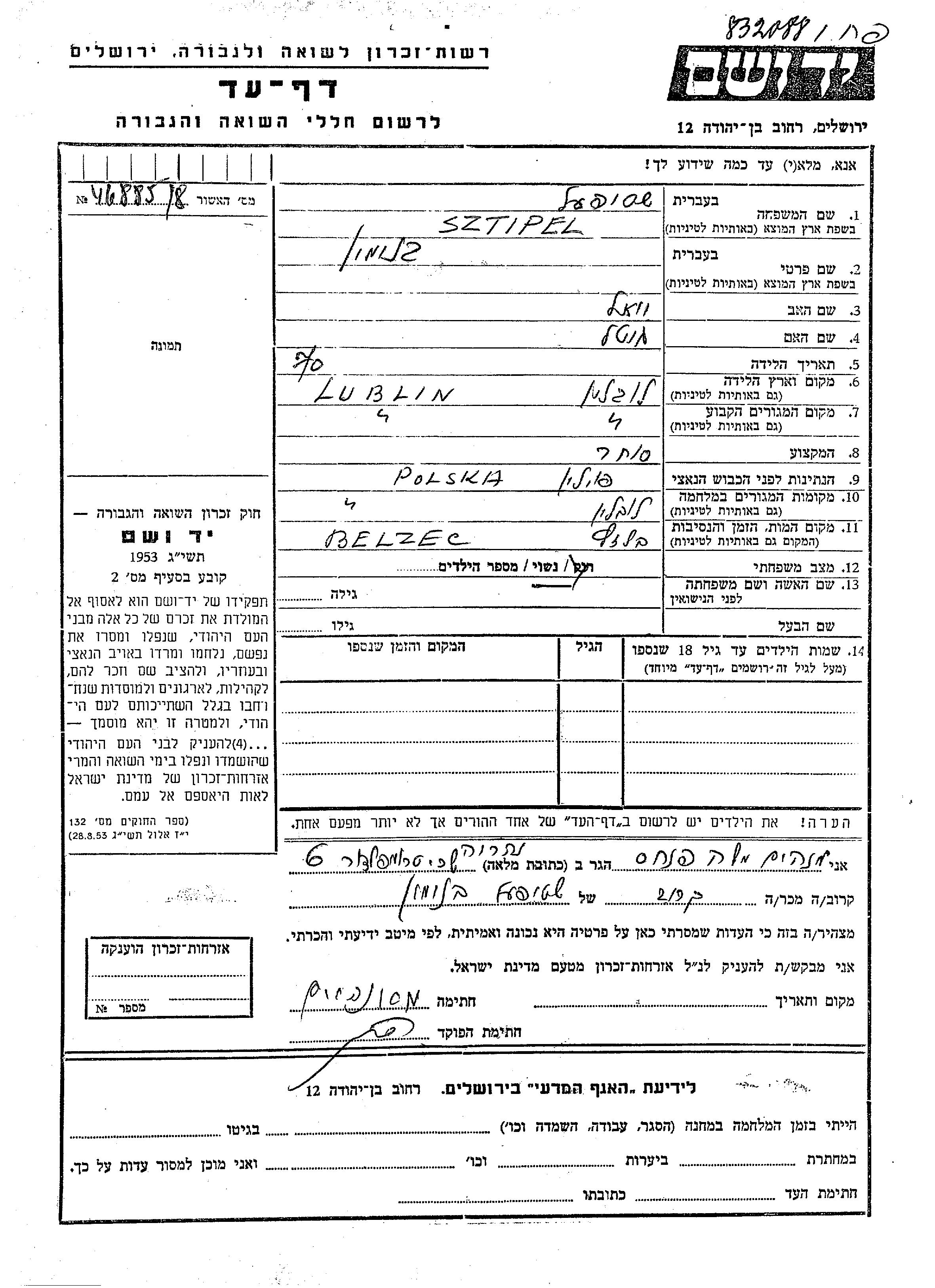 Beniamin Sztipel Shtifel wurde in Lublin, Polen geboren. Er war der Sohn von Yoel und Gitel. Er war Kaufmann/-frau und Verheiratet. Vor dem Zweiten Weltkrieg lebte er in Lublin, Polen. Während des Krieges war er in Lublin, Polen.