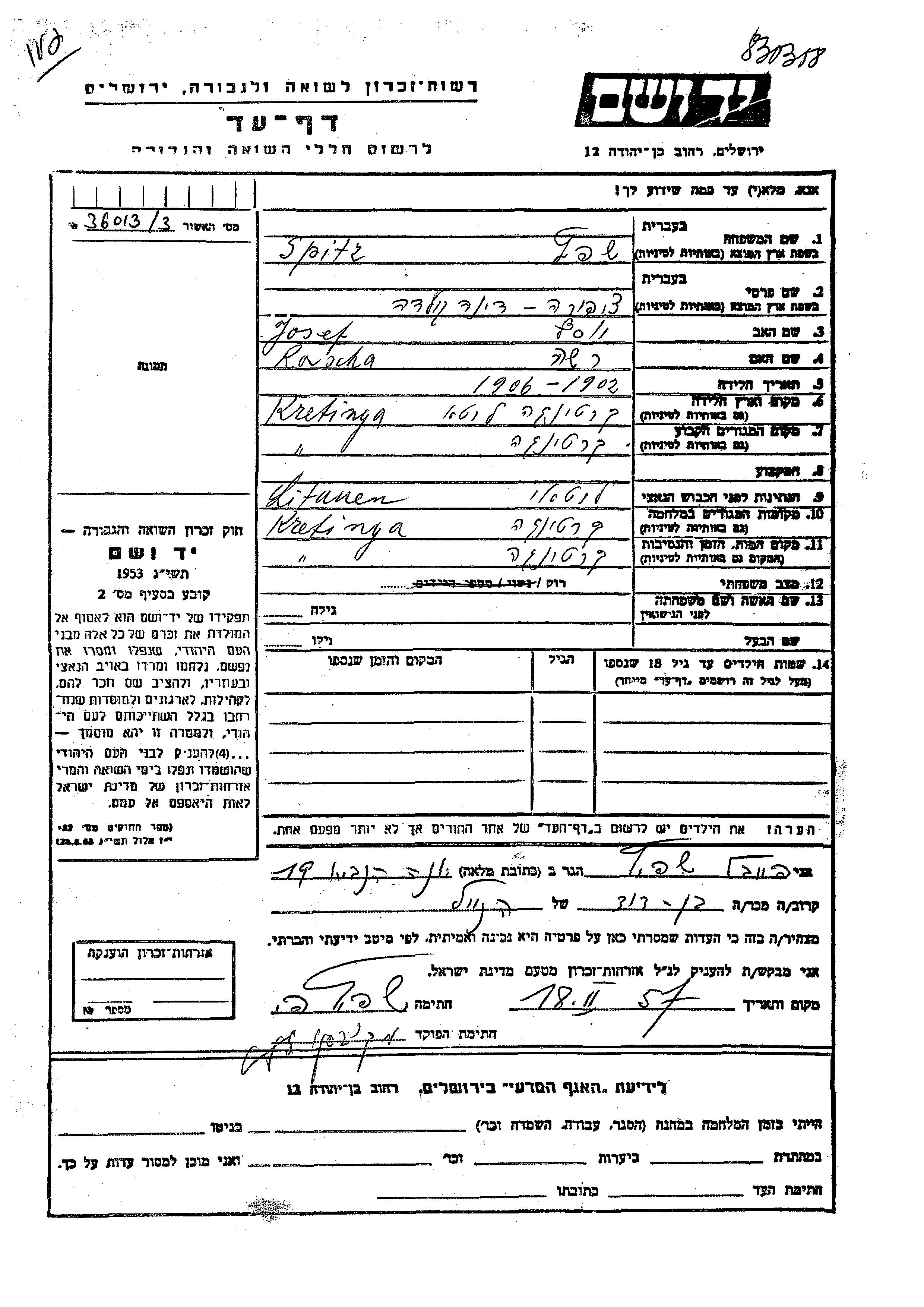 Spitz Tzipora Dina Golda 1902 Kretinga, Litauen Gedenkblatt