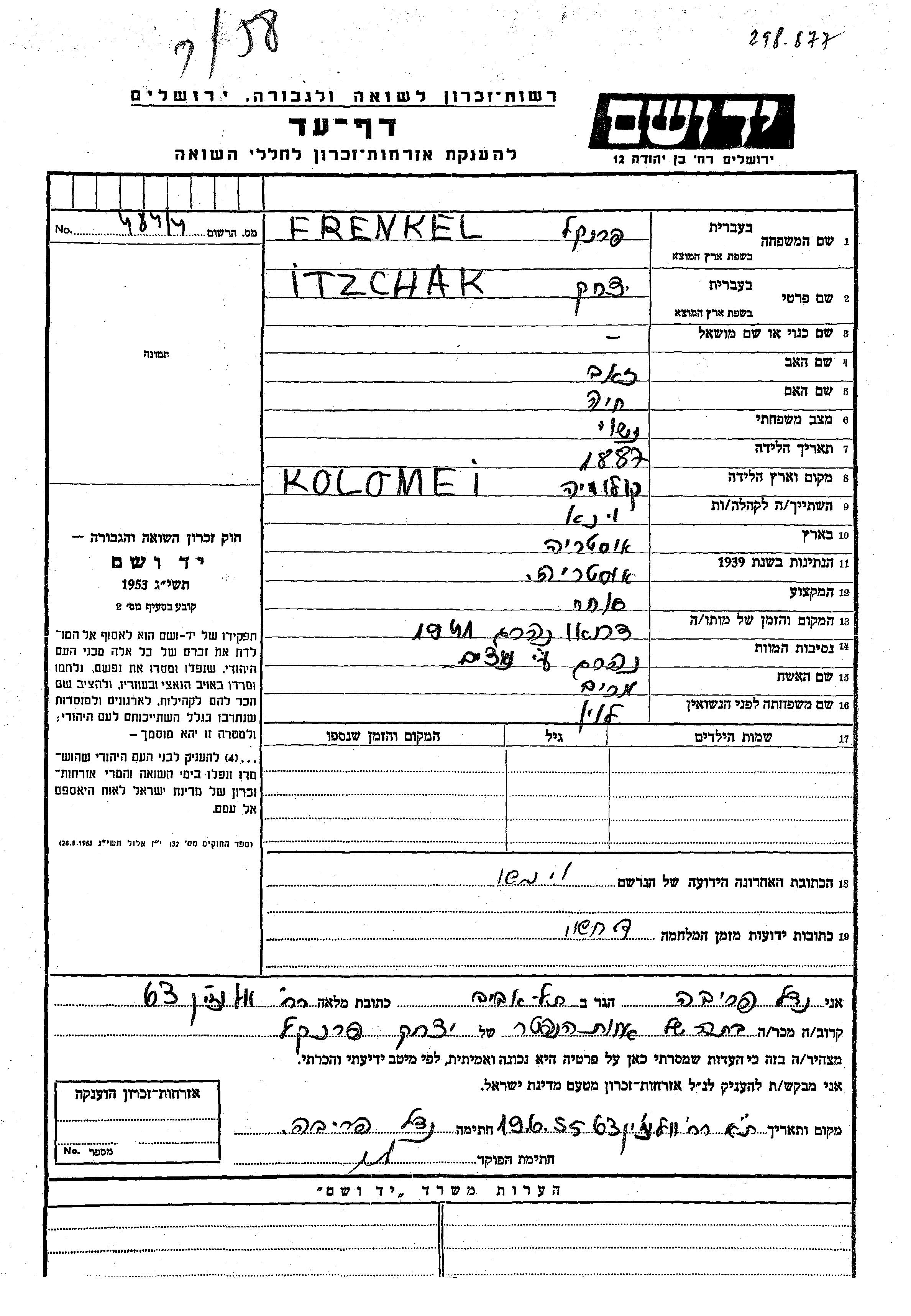Itzchak Frenkel wurde im Jahr 1887 in Kolomyja, Polen geboren. Er war der Sohn von Zeev und Khaia. Er war mit Miriam, geb. Levin Verheiratet. Vor dem Zweiten Weltkrieg lebte er in Wien, Österreich. Während des Krieges war er in Österreich.
