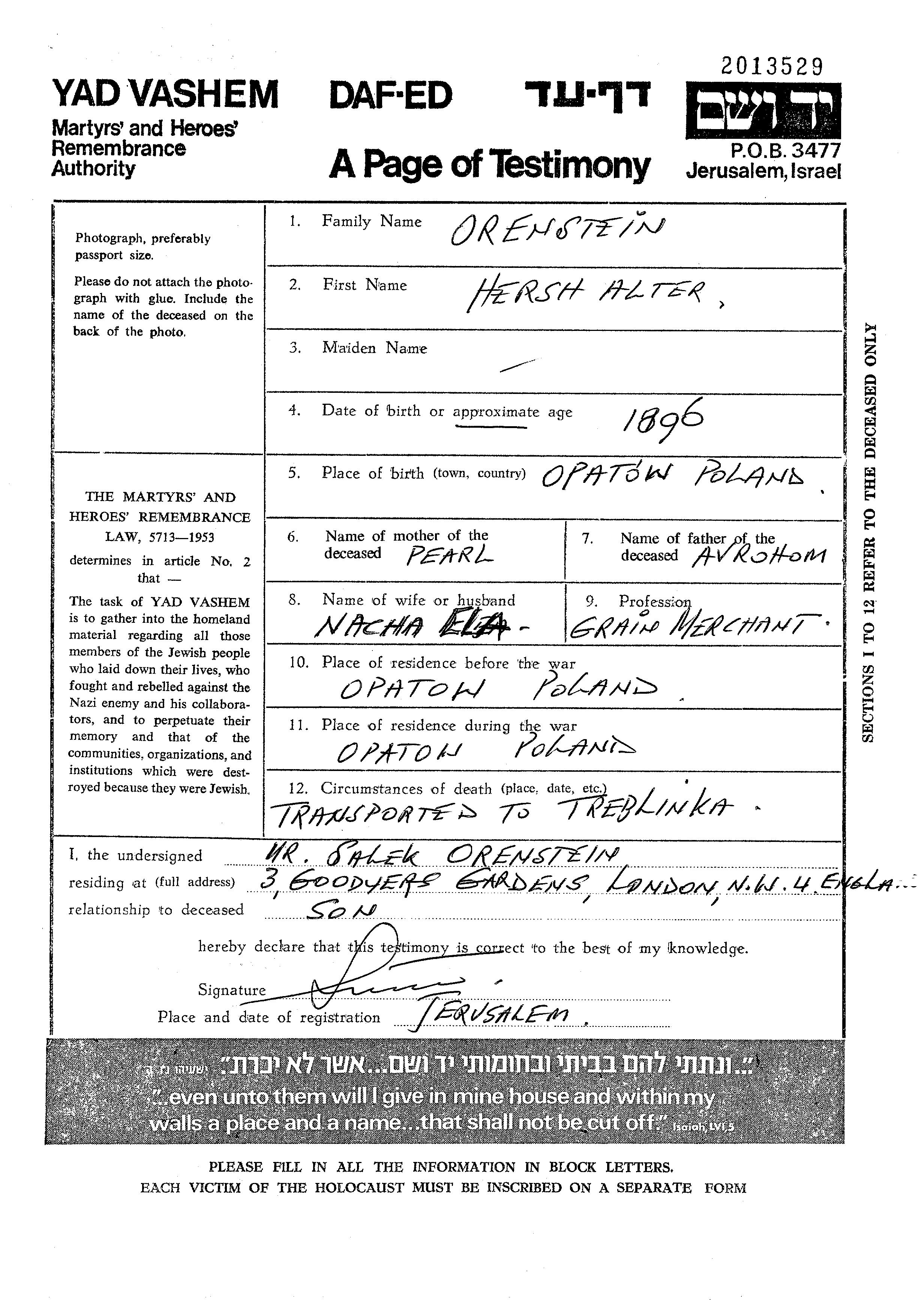Salek Orenstein. Vor dem Zweiten Weltkrieg lebte er in Opatow, Polen.