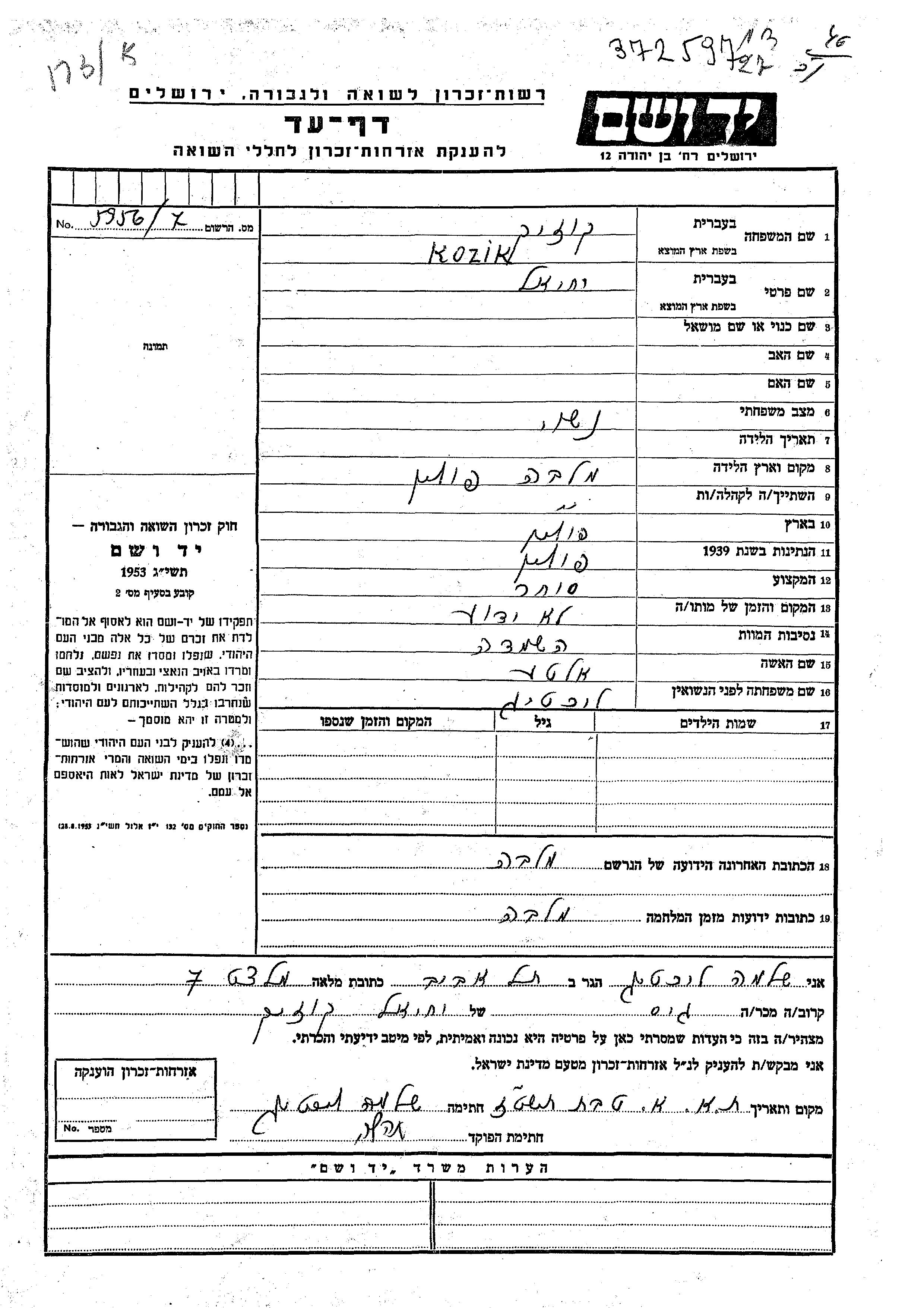 Yekhiel Kozik wurde in Mlawa, Polen geboren. Er war Kaufmann/-frau. Vor dem Zweiten Weltkrieg lebte er in Mlawa, Polen. Während des Krieges war er in Mlawa, Polen.