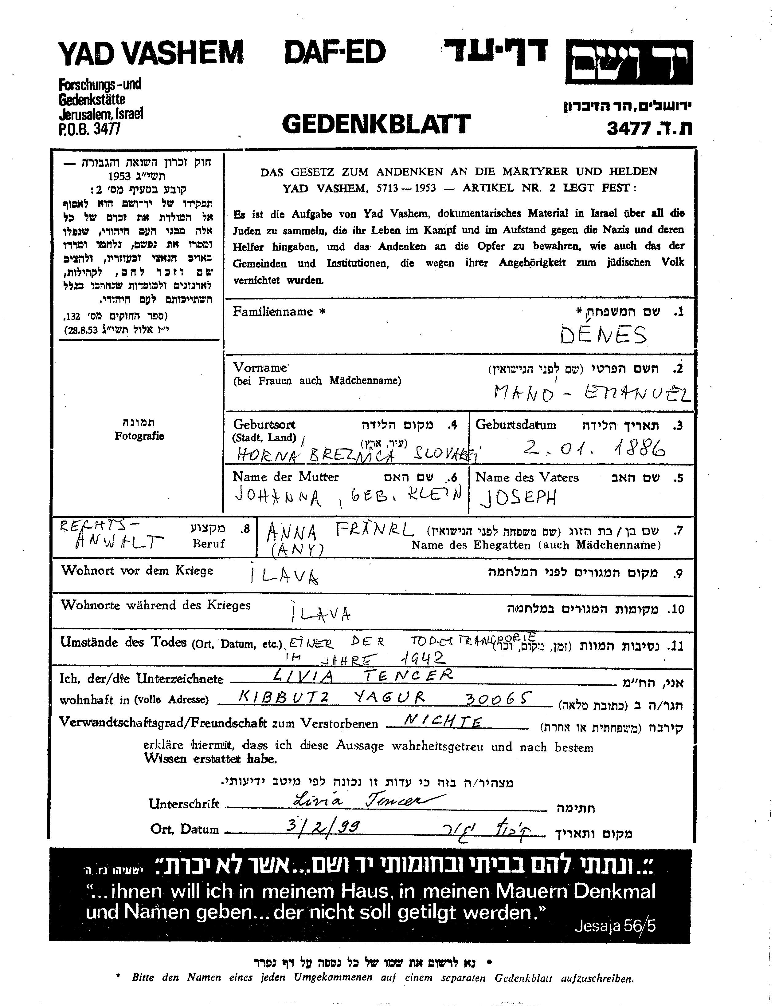 Emanuel Denes wurde im Jahr 1886 in Horna Breznica, Tschechoslowakei geboren. Er war der Sohn von Joseph und Johanna. Er war Rechtsanwalt/rechtsanwältin und mit Anna, geb. Fränkl Verheiratet. Vor dem Zweiten Weltkrieg lebte er in Ilava, Tschechoslowakei. Während des Krieges war er in Ilava, Tschechoslowakei.